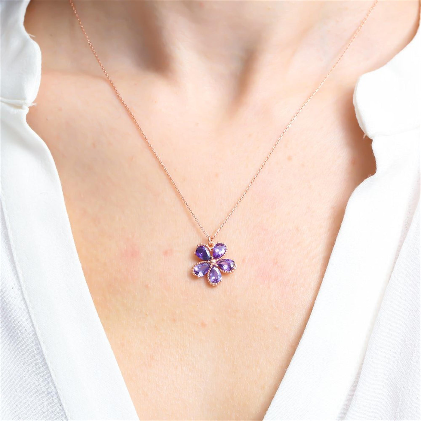 A bloom touched by twilight—the Amethyst Color Blossom Radiance CZ Rose Gold 925K Sterling Silver Necklace captures the quiet elegance of nature’s most graceful moments. At its center, an amethyst color cubic zirconia radiates with deep purple light, symbolizing intuition, peace, and inner strength.