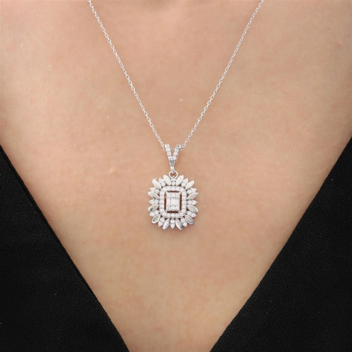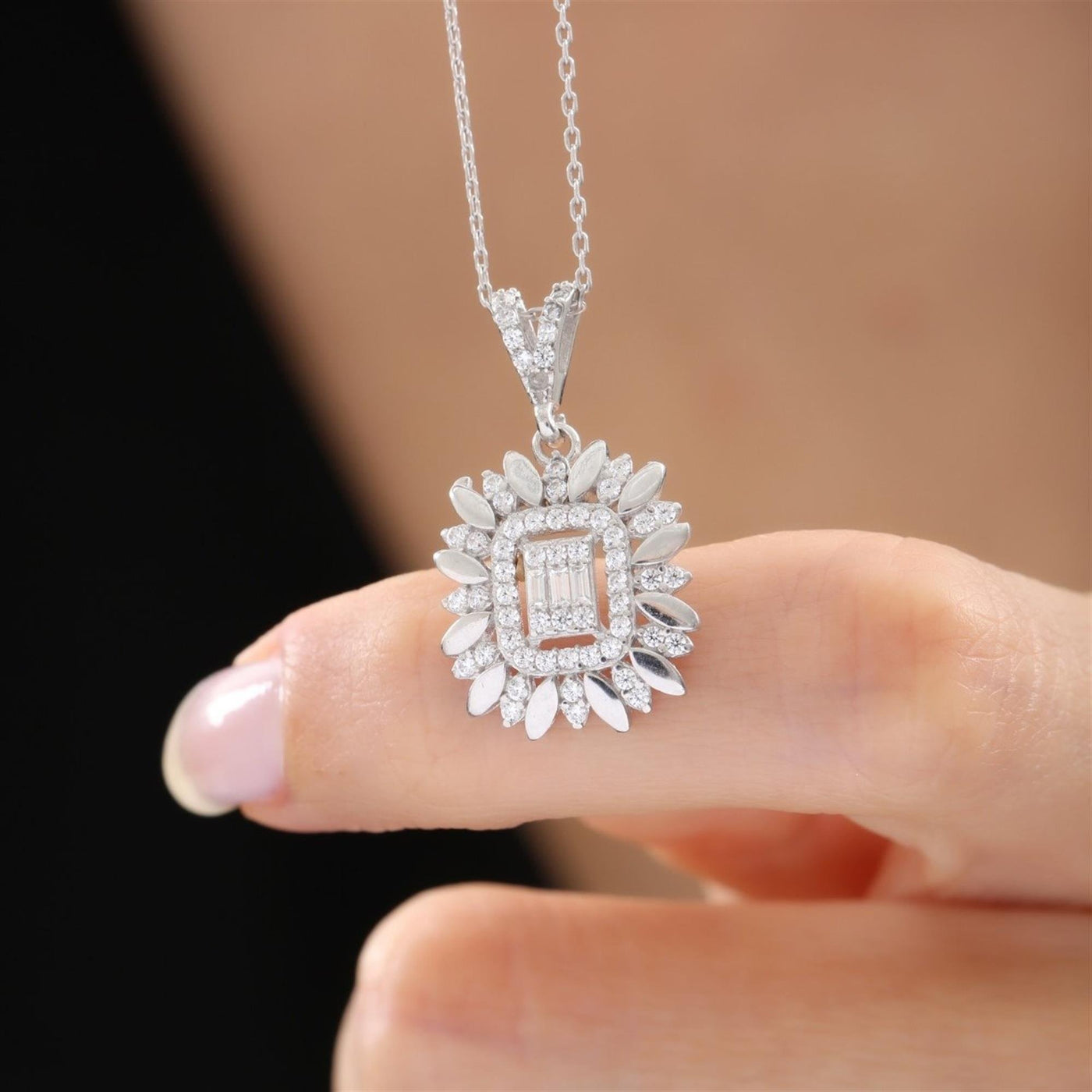 Presented in a luxurious Etossimo Jewelry gift box and bag, the Baguette Sunburst Bloom Pure Elegance CZ 925K Sterling Silver Necklace is a luminous expression of grace and sophistication.
