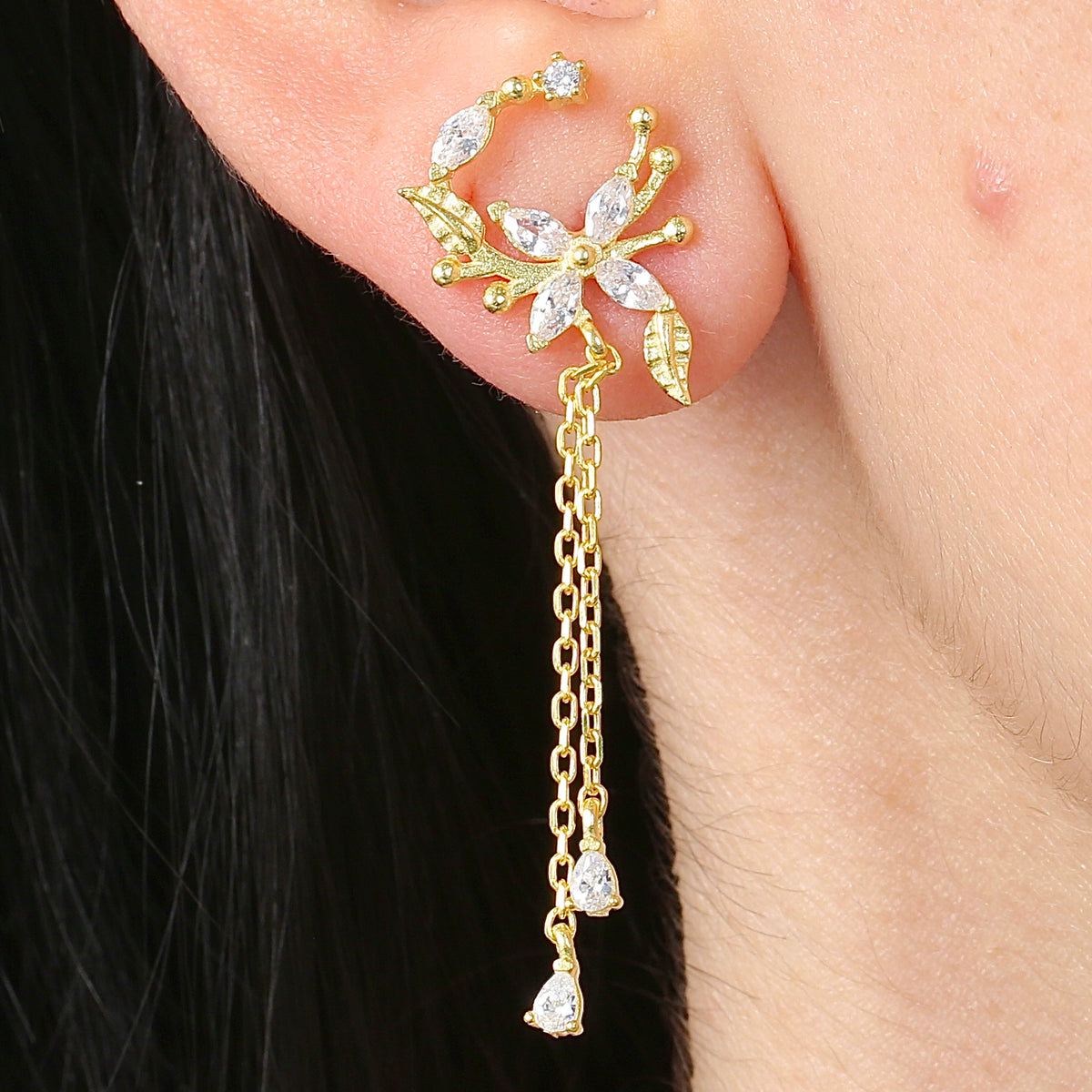 Celestial Moon Flower Drop Dangles CZ 14K Gold Earrings