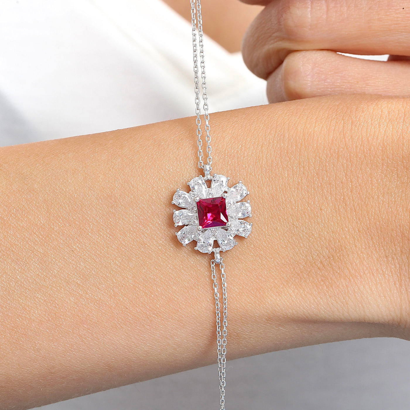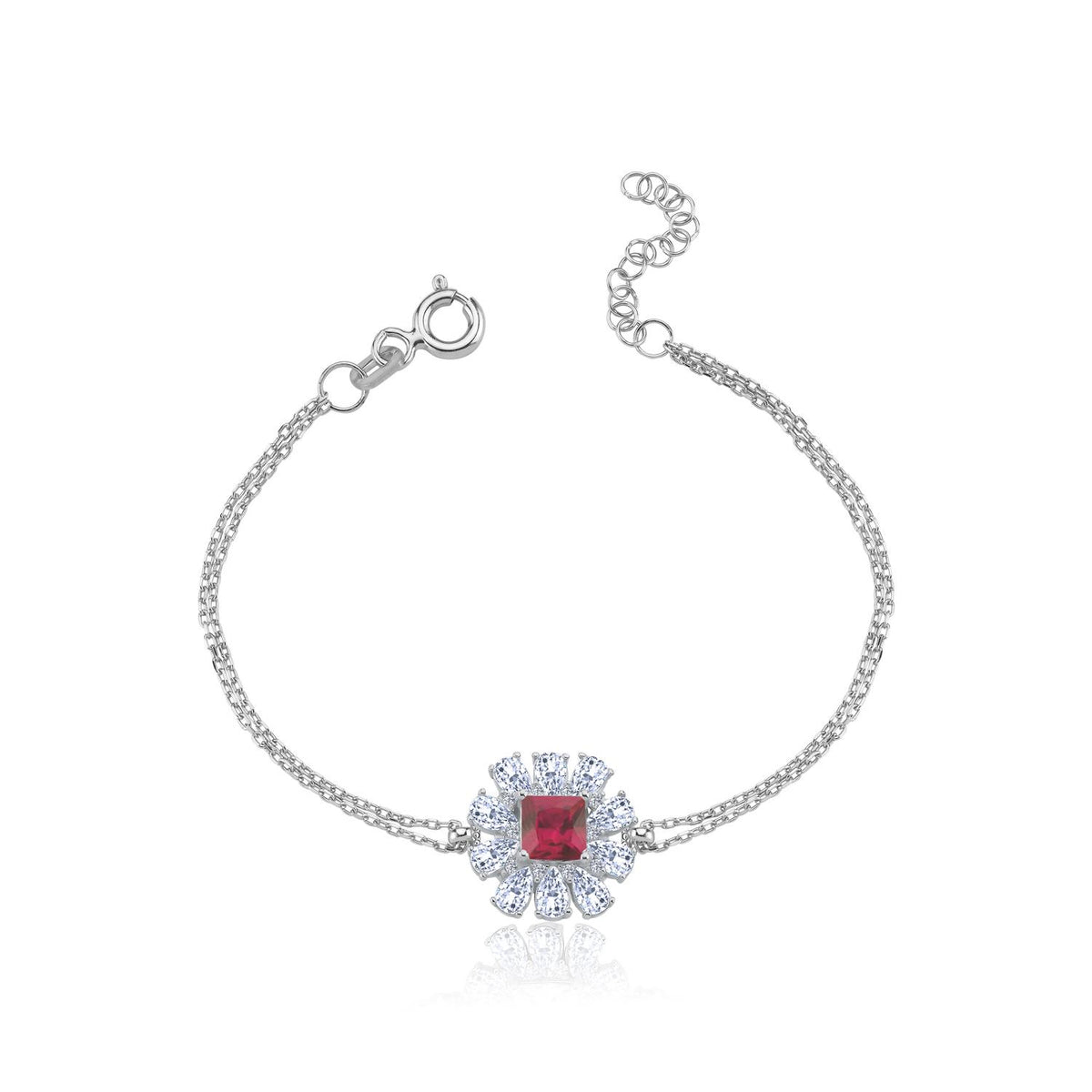 Radiate strength and passion with the Crystal Crown Bloom Ruby Color CZ 925K Sterling Silver Bracelet. Featuring ruby color cubic zirconia stones in a regal crown-like floral design, this bracelet glows with rich red brilliance—symbolizing love, vitality, and timeless confidence.