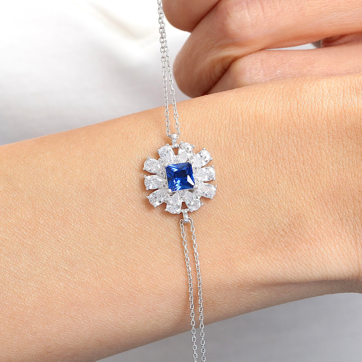 Crystal Crown Bloom Sapphire Color CZ 925K Sterling Silver Bracelet