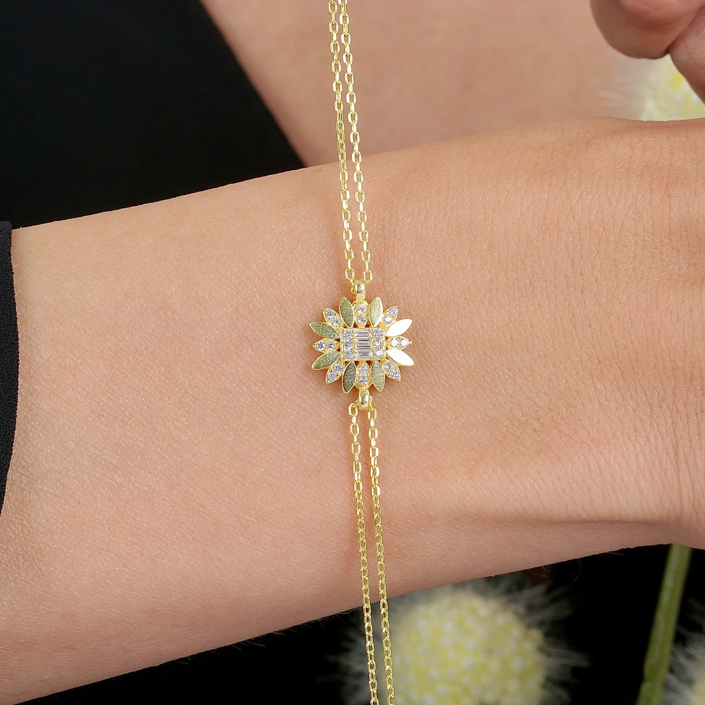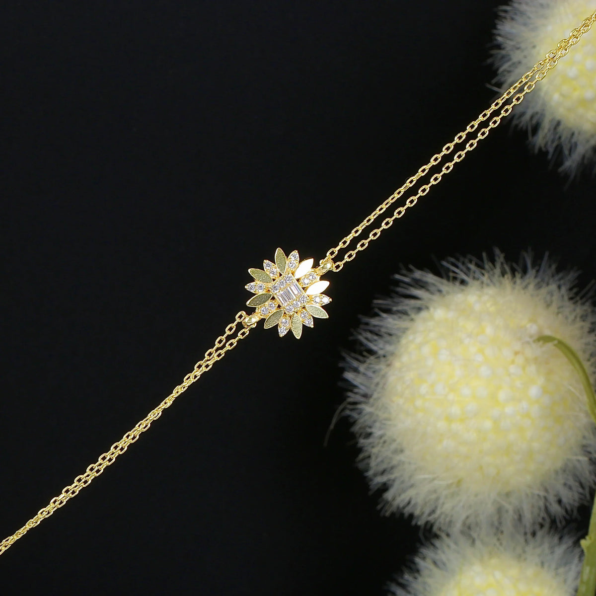 The Dazzling Sunflower Glow CZ 14K Gold Bracelet brings the vibrant energy of a sunflower to life with its stunning design. Crafted in 14K gold, this bracelet features a radiant sunflower motif, with the petals adorned in brilliant cubic zirconia (CZ) stones that sparkle like sunlight. The CZ stones are carefully set to enhance the natural beauty of the sunflower, radiating an eye-catching glow that adds a touch of luxury to the piece.