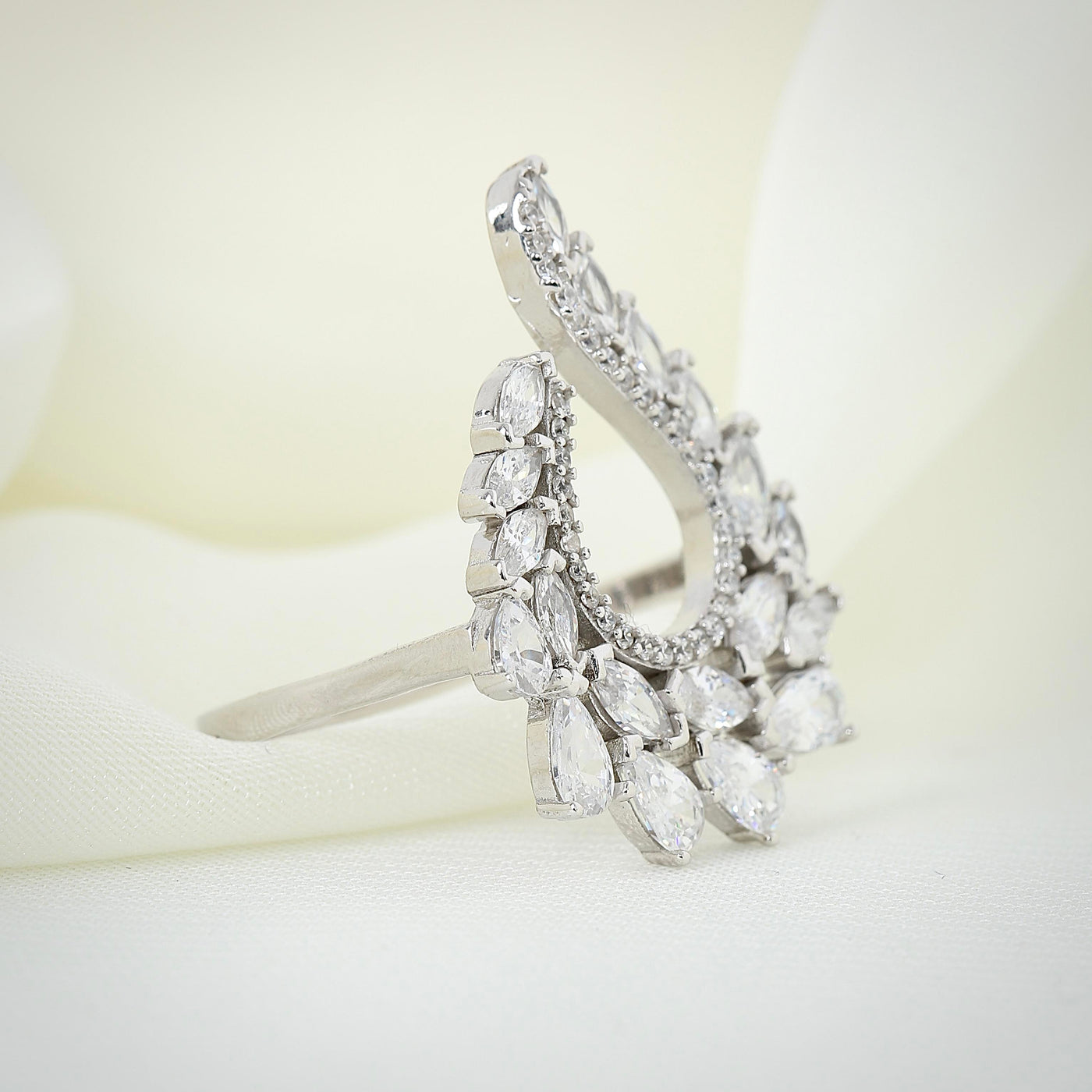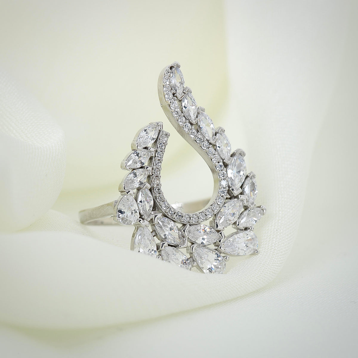 The Elegant Ocean Serenade CZ 925K Sterling Silver Ring is a stunning testament to the beauty of the ocean, combining elegance and sophistication. Crafted from high-quality 925K sterling silver, this exquisite ring features a brilliant array of marquis-cut cubic zirconia stones that form an intricate, wave-like design, with a delicate halo of smaller round cubic zirconia stones accenting the shape. The sparkling stones are reminiscent of the gentle ebb and flow of the sea, creating a fluid, mesmerizing effect with every movement.
