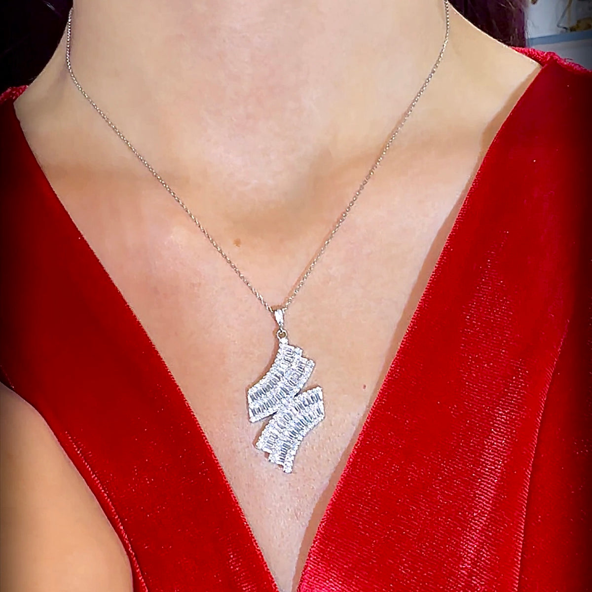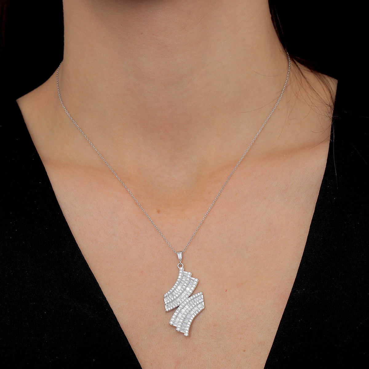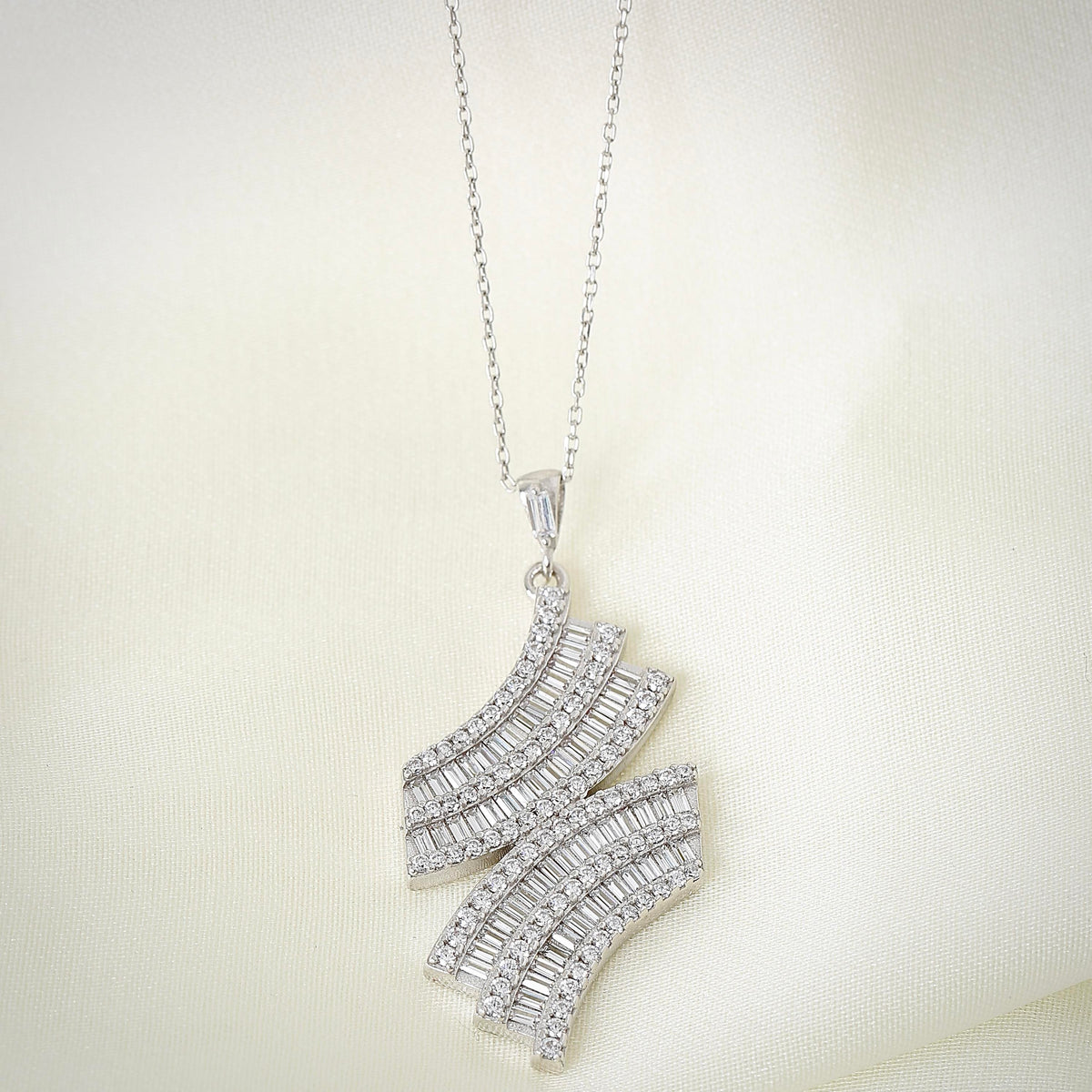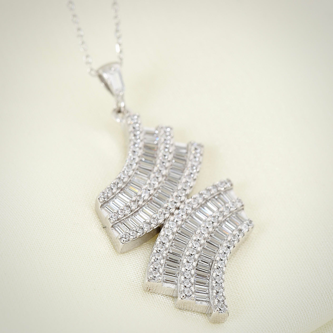 Introducing the Elegant Sparkling Embrace CZ 925K Sterling Silver Necklace, a captivating and luxurious addition to your jewelry collection. This stunning piece features meticulously set cubic zirconia stones in round brilliant and baguette cuts, creating a perfect blend of sparkle and elegance. Crafted from premium 925K sterling silver and finished with a rhodium plating to enhance its brilliance, this necklace is designed to capture light from every angle.