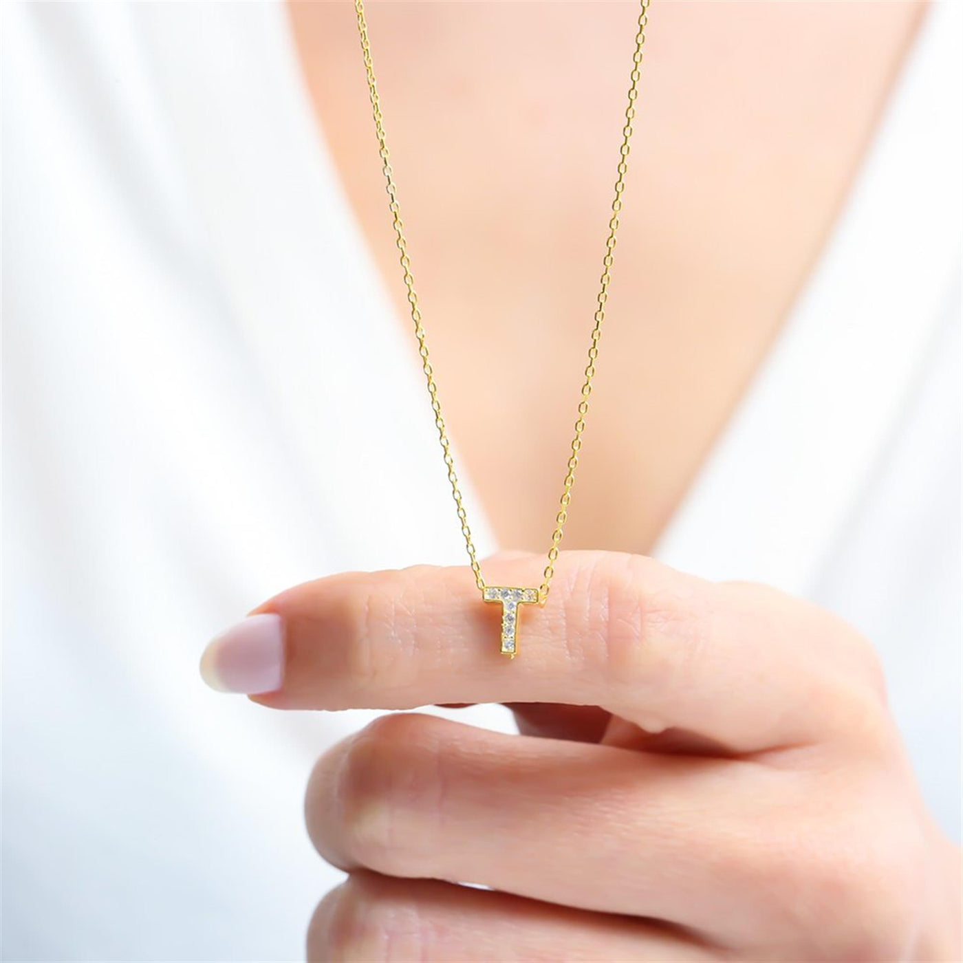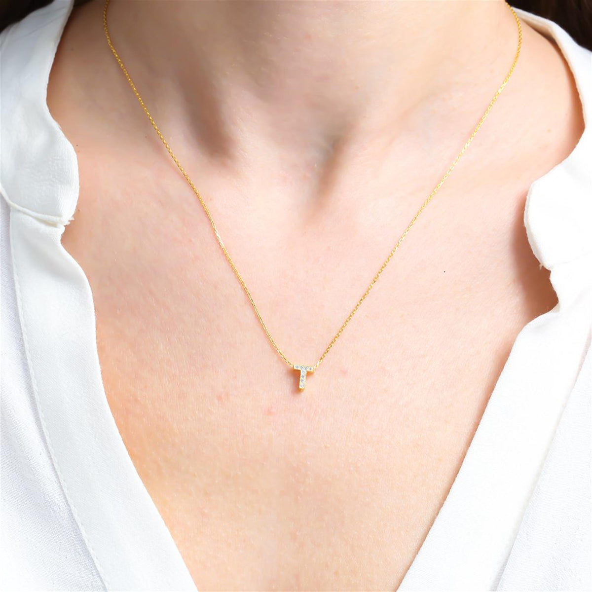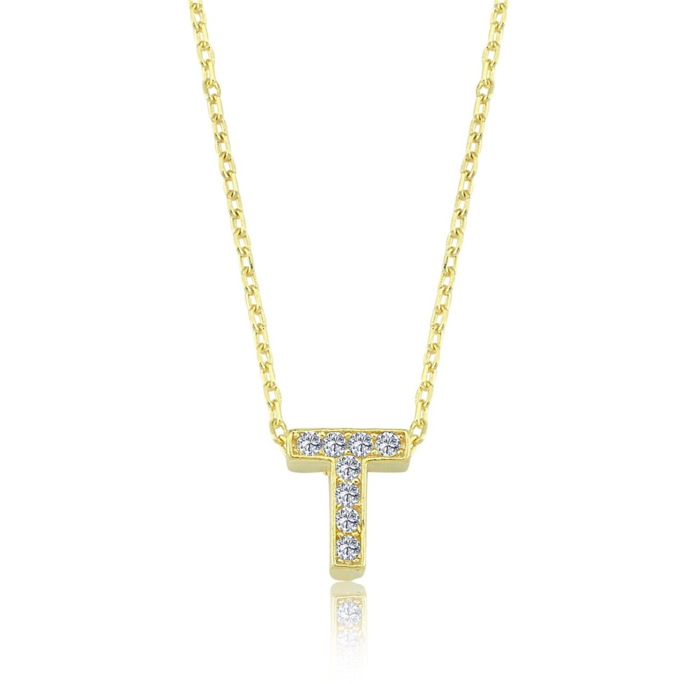 Elegant T Initial Sparkle CZ 14K Gold Necklace