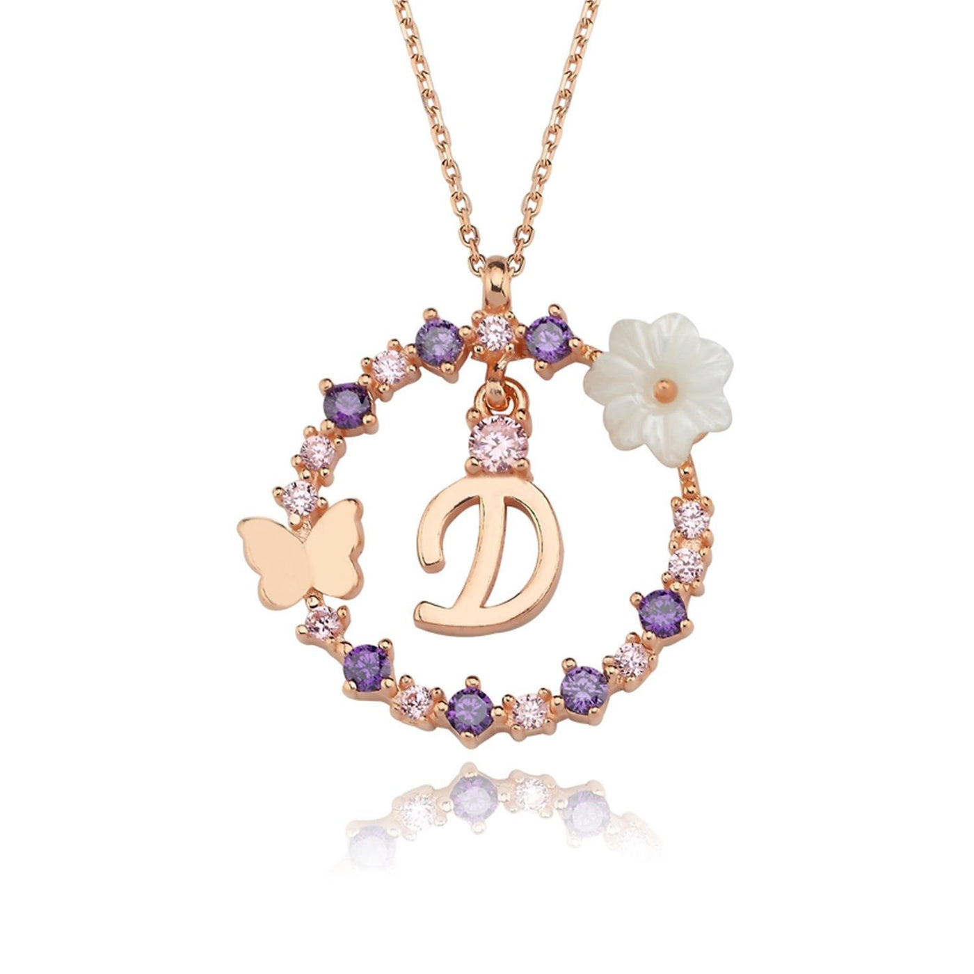 Floral Dream D Initial CZ Rose Gold 925K Sterling Silver Necklace