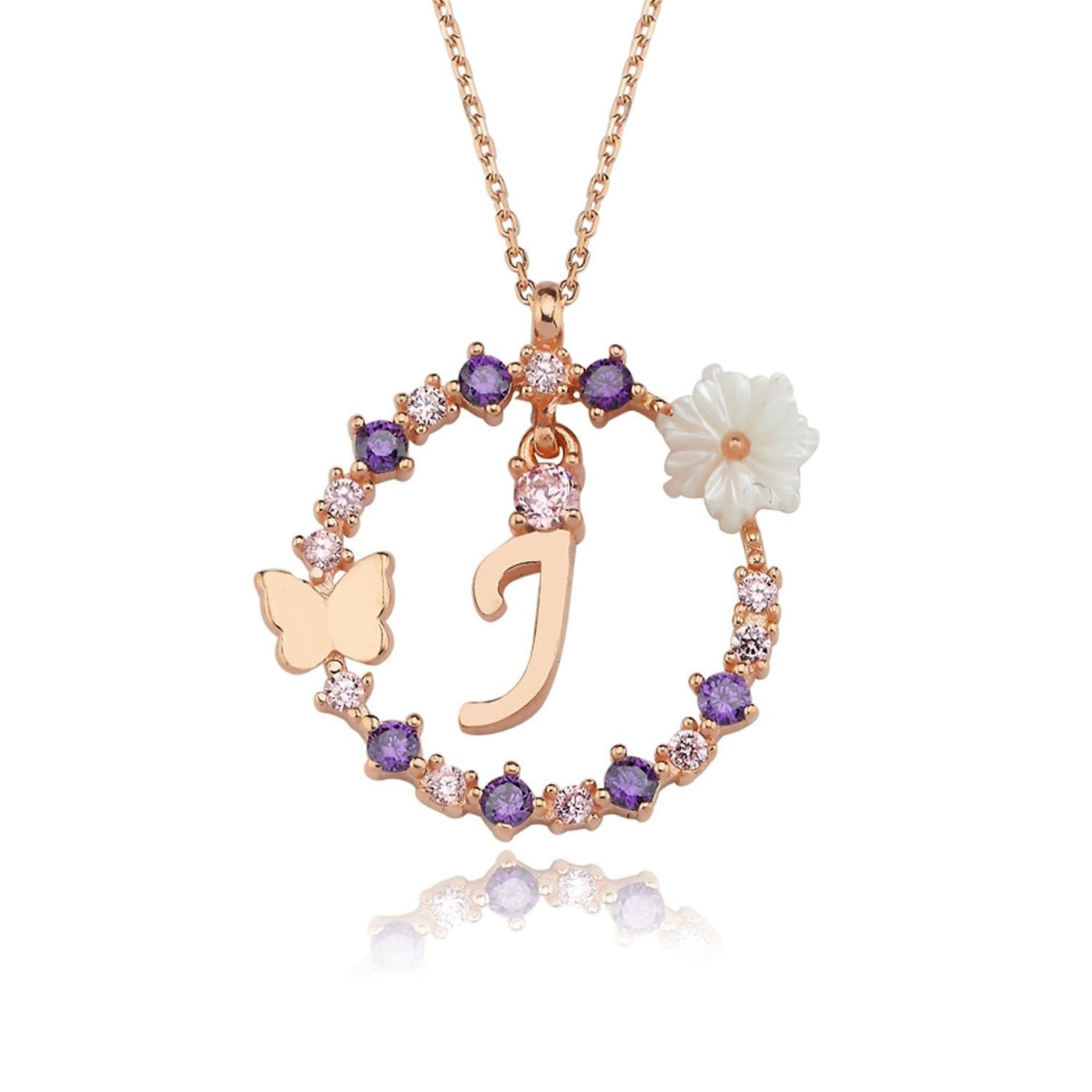 Floral Dream J Initial CZ Rose Gold 925K Sterling Silver Necklace