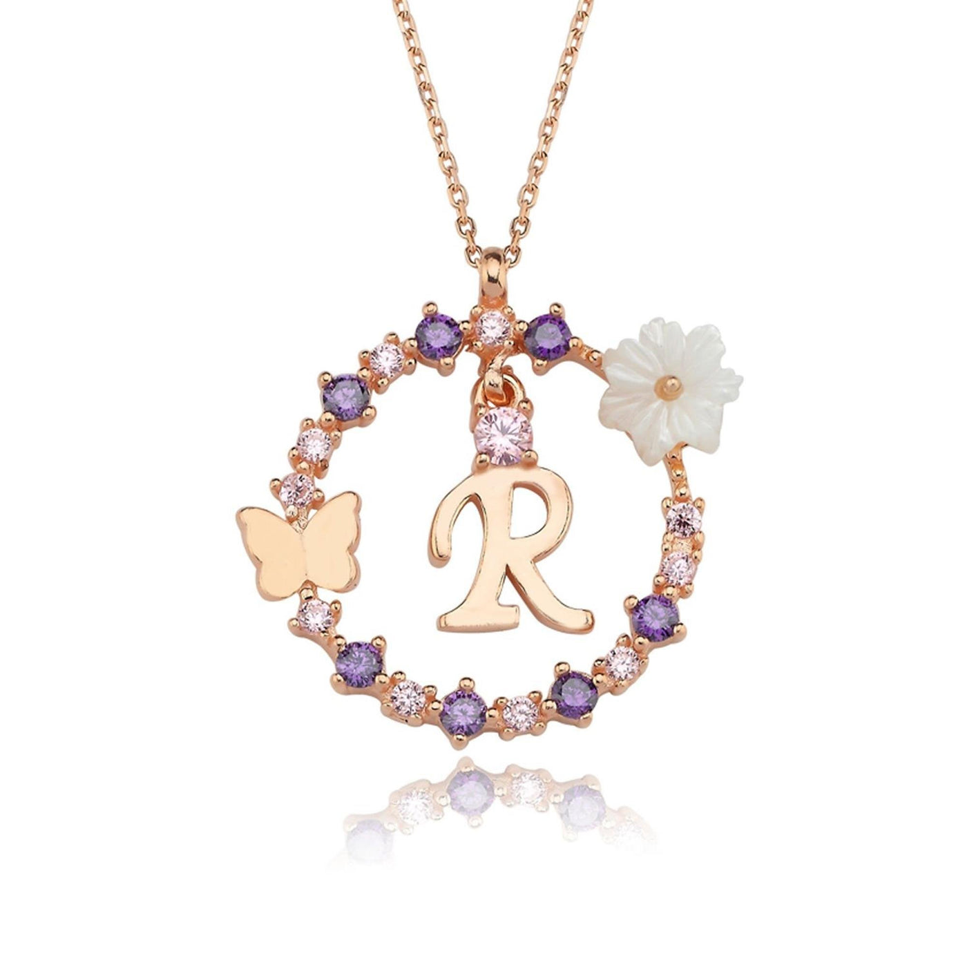Floral Dream R Initial CZ Rose Gold 925K Sterling Silver Necklace