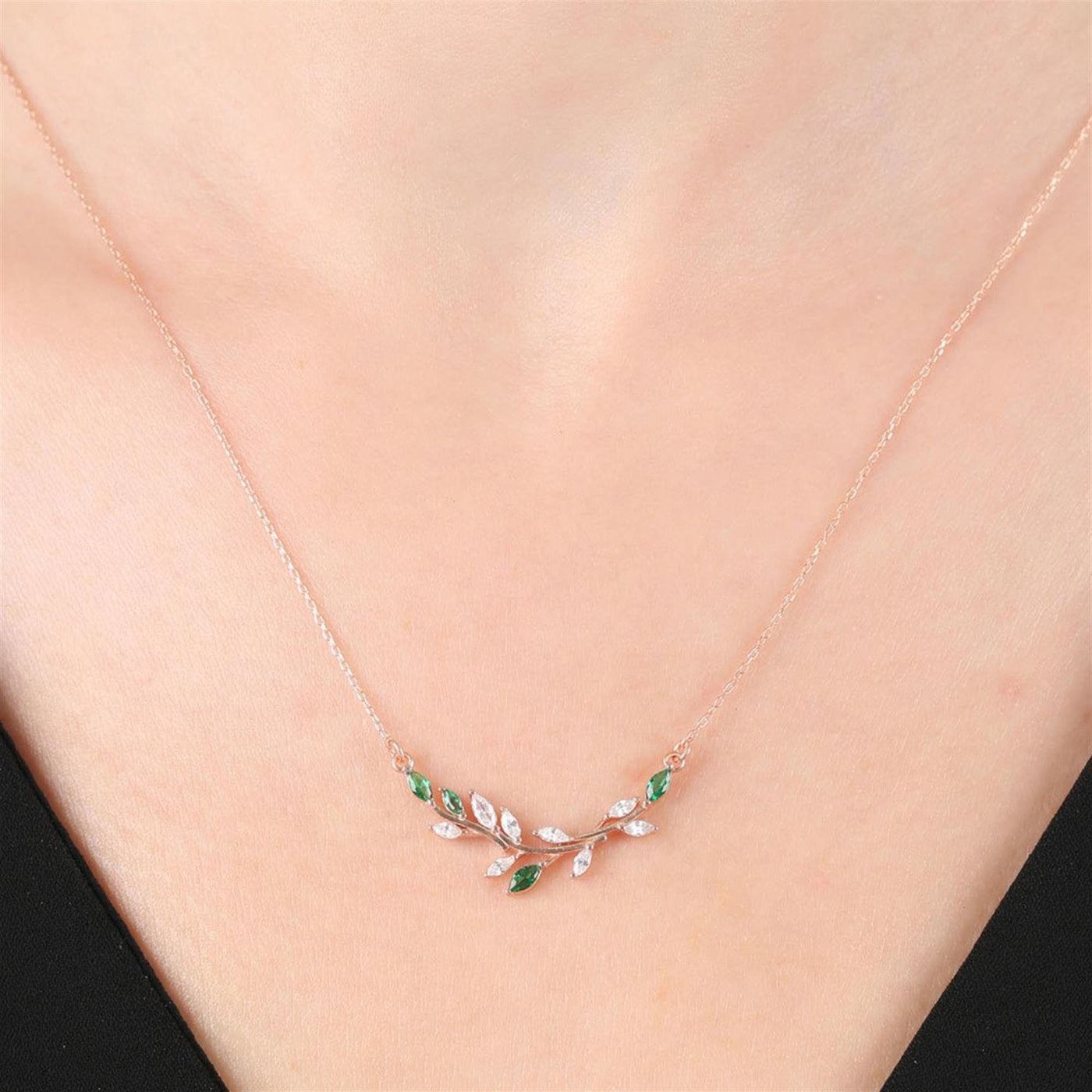 Graceful Emerald Color Leaf Vine CZ Rose Gold 925K Sterling Silver Necklace