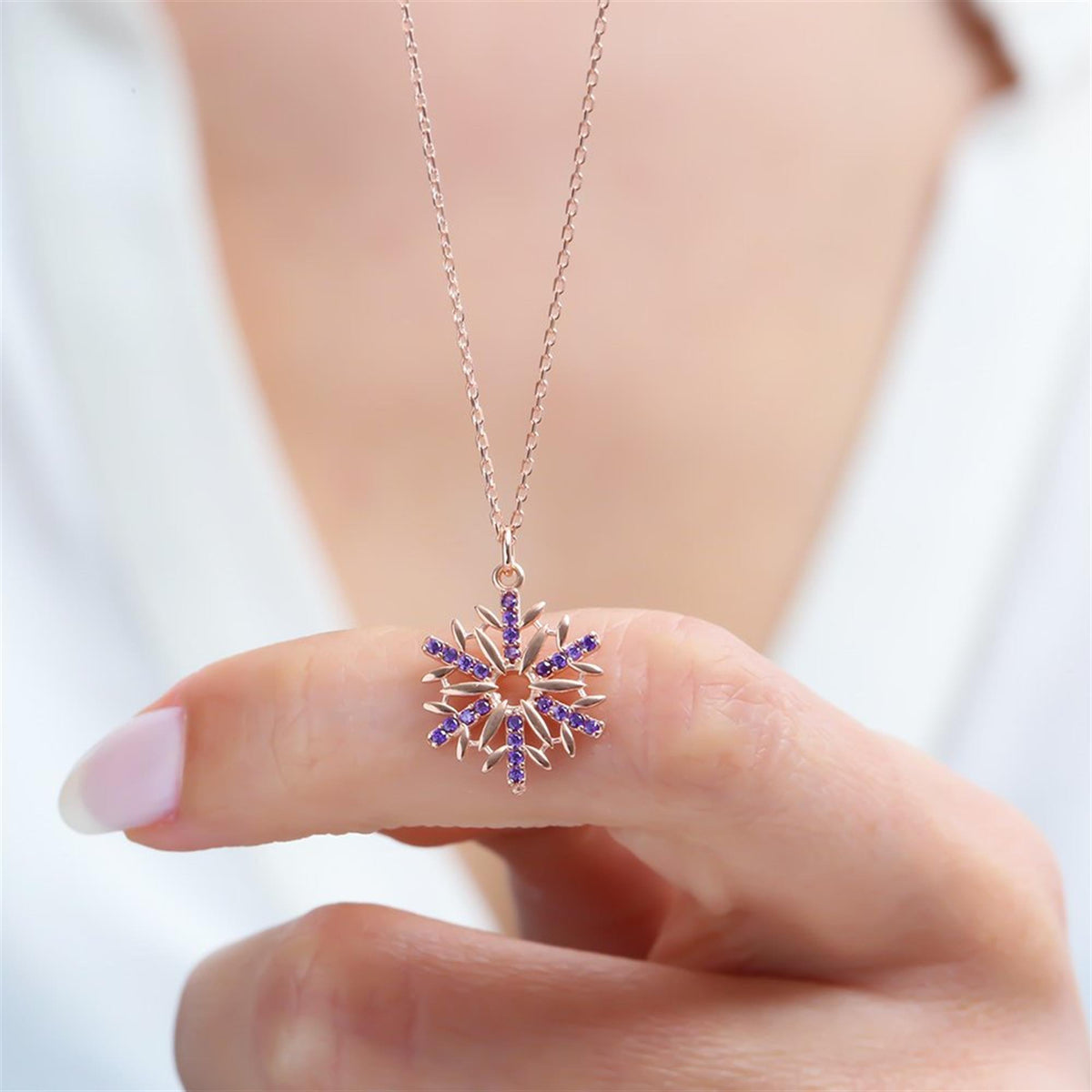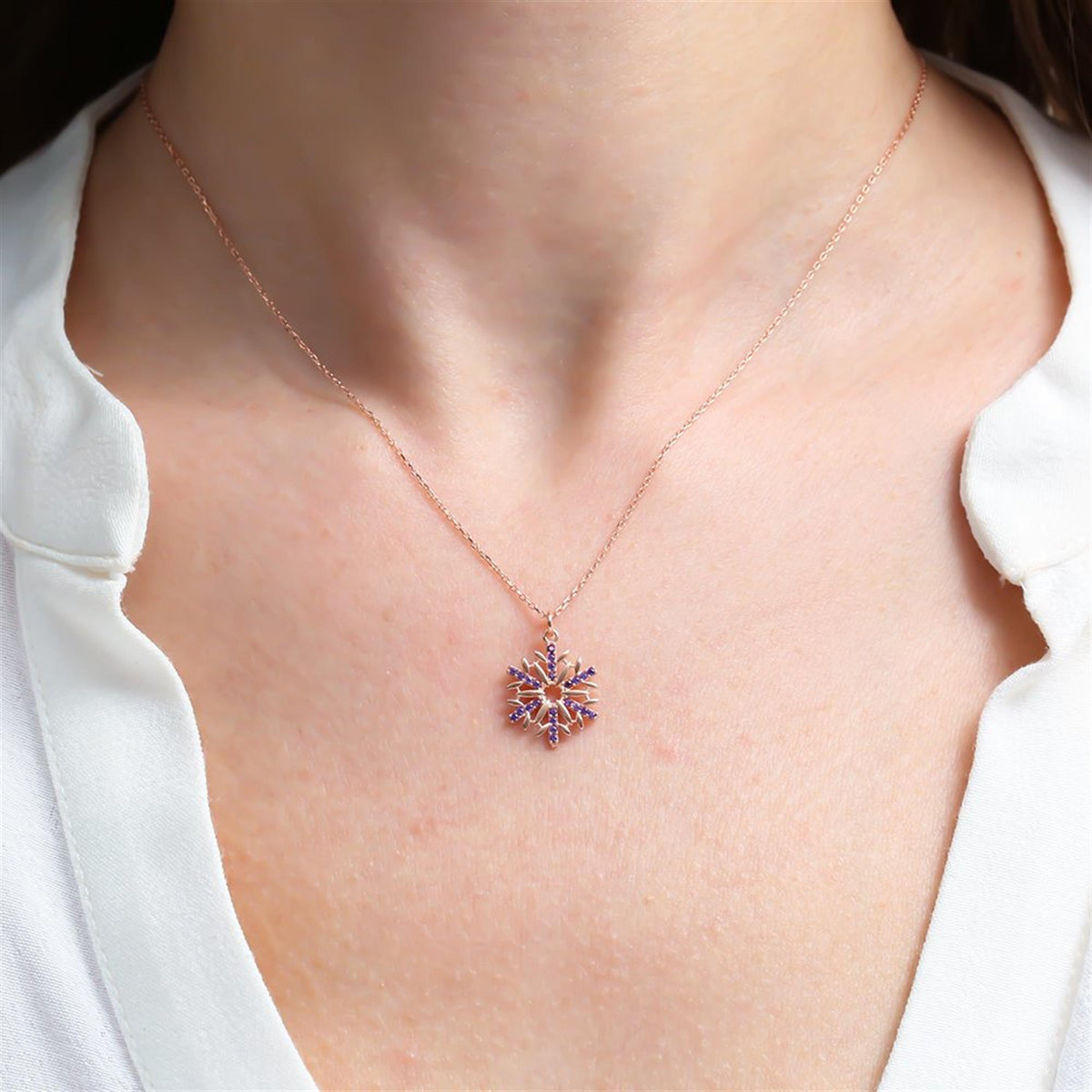 Step into a celestial dreamscape with the Lustrous Icy Star Crystal Amethyst Color CZ Rose Gold 925K Sterling Silver Necklace. This enchanting piece features a radiant snowflake-inspired design, brought to life by an amethyst color cubic zirconia that glows with deep, mysterious purple hues. The intricate crystal-like form symbolizes clarity, transformation, and spiritual brilliance, making this necklace not only a captivating accessory but also a meaningful expression of inner strength and elegance.