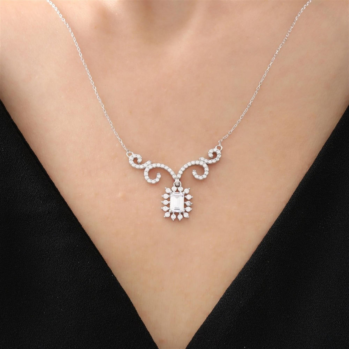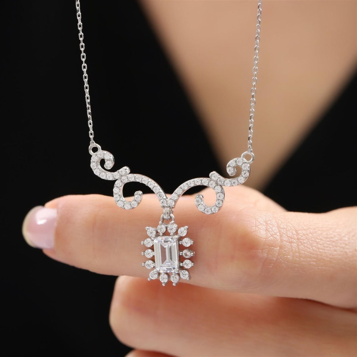 The Lustrous Sunstar Baguette Baroque Romance CZ 925K Sterling Silver Necklace is a stunning ode to timeless elegance and ornamental beauty. Crafted from 925K sterling silver, this exquisite necklace features a radiant sunstar motif embellished with high-quality baguette-cut cubic zirconia, capturing the opulence of baroque charm with a modern flair.
