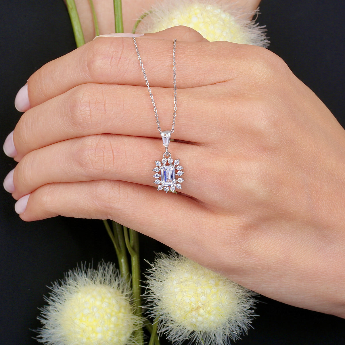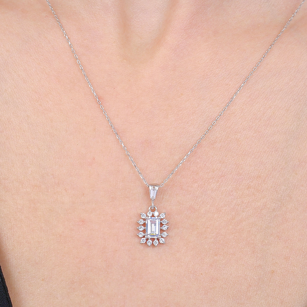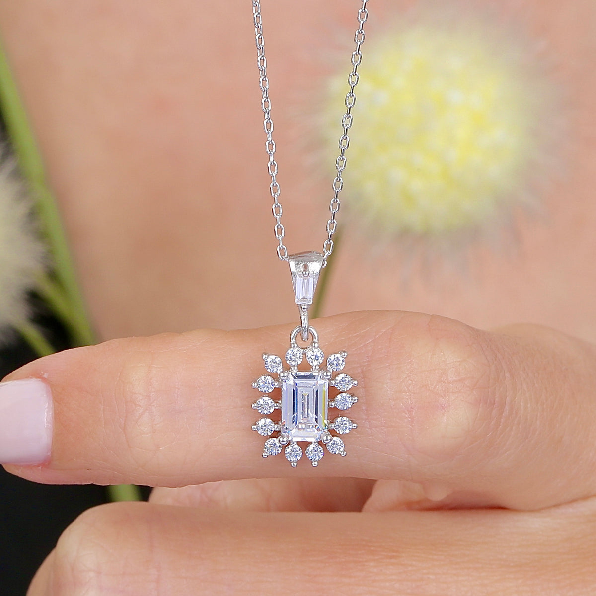 Radiate elegance with the Lustrous Sunstar Baguette CZ 925K Sterling Silver Necklace, where bold design meets captivating brilliance. Featuring a striking baguette-cut cubic zirconia at its heart, encircled by a mesmerizing sunburst-inspired pattern, this exquisite piece captures the essence of radiant energy and timeless sophistication.