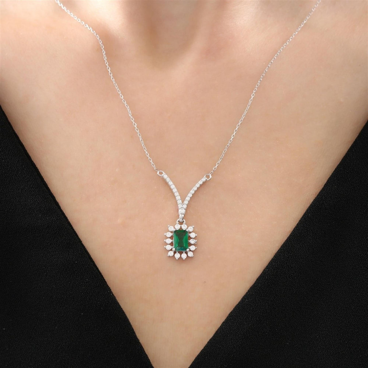 The Lustrous Sunstar Baguette Emerald Color Modern Glamour CZ 925K Sterling Silver Necklace captures the essence of contemporary elegance with a vibrant green twist. Masterfully crafted from 925K sterling silver, this captivating necklace features a radiant sunburst motif, accentuated by emerald color baguette-cut high-quality cubic zirconia stones that dazzle with fresh, green brilliance.