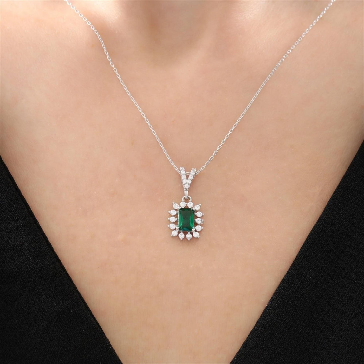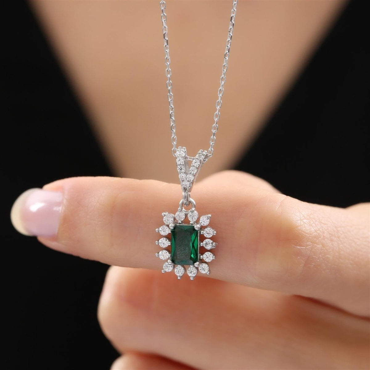 The Lustrous Sunstar Baguette Emerald Color Pure Elegance CZ 925K Sterling Silver Necklace is a graceful embodiment of nature’s serenity and refined sparkle. Meticulously crafted from 925K sterling silver, this exquisite necklace features a radiant sunburst silhouette adorned with emerald color baguette-cut high-quality cubic zirconia stones that glow with vivid green brilliance.