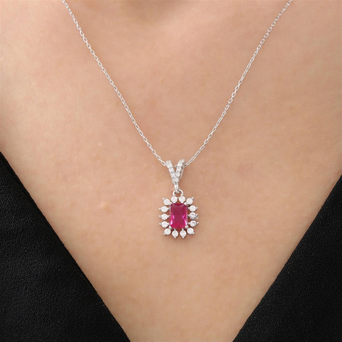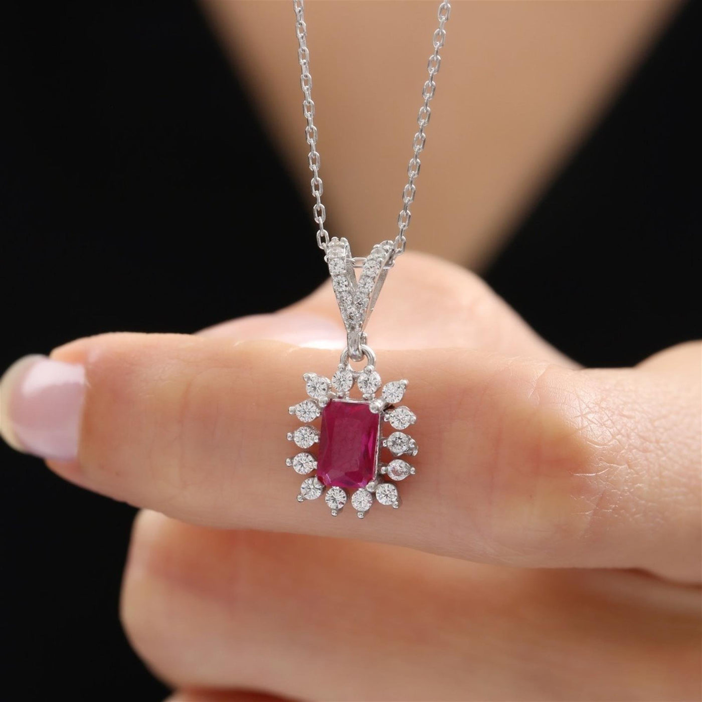 The Lustrous Sunstar Baguette Ruby Color Pure Elegance CZ 925K Sterling Silver Necklace is a graceful tribute to feminine strength and refined sparkle. Crafted from 925K sterling silver, this luminous design features a radiant sunburst silhouette, embellished with ruby color baguette-cut high-quality cubic zirconia stones that glow with captivating red brilliance.