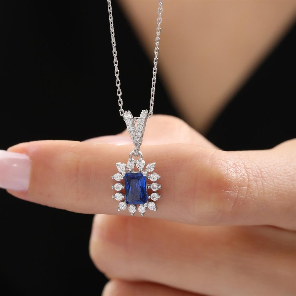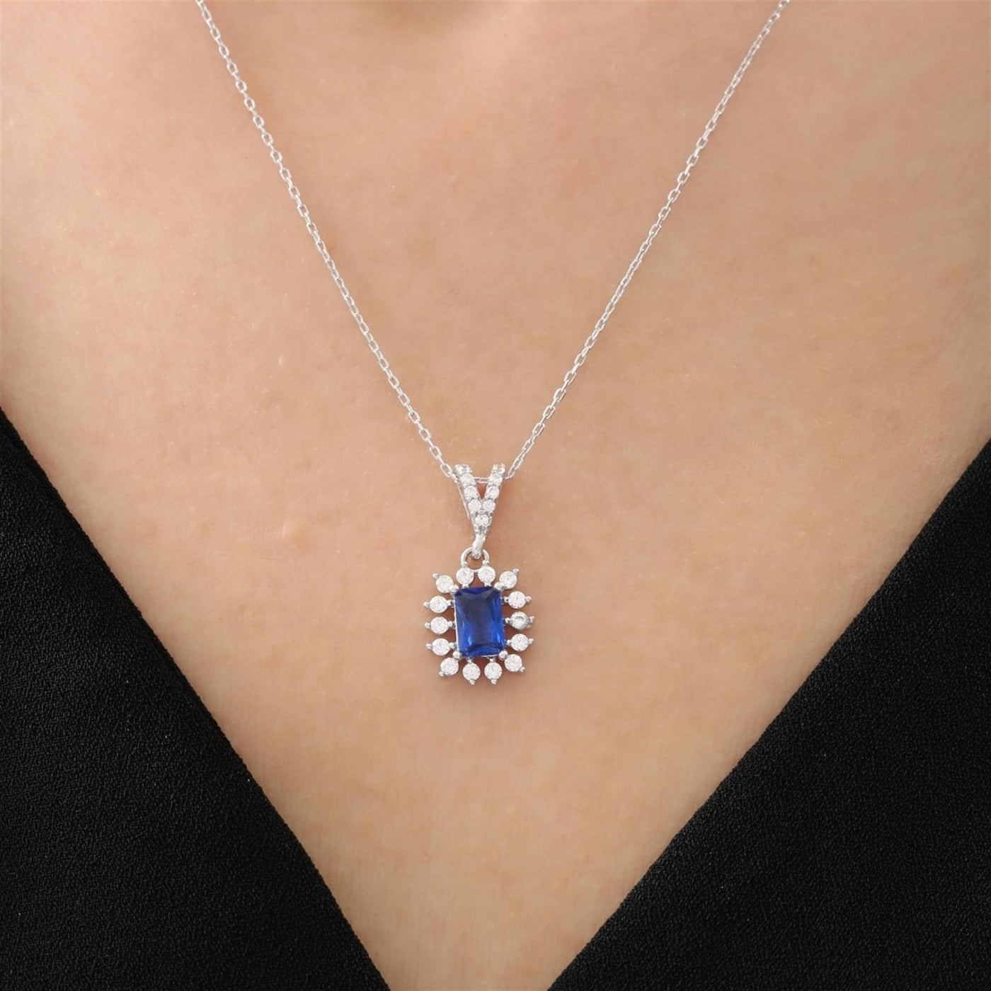 The Lustrous Sunstar Baguette Sapphire Color Pure Elegance CZ 925K Sterling Silver Necklace evokes celestial charm with a refined modern twist. Crafted from 925K sterling silver, this radiant necklace showcases an elegant sunburst motif, accentuated by sapphire color baguette-cut high-quality cubic zirconia stones that gleam in rich hues of deep blue.