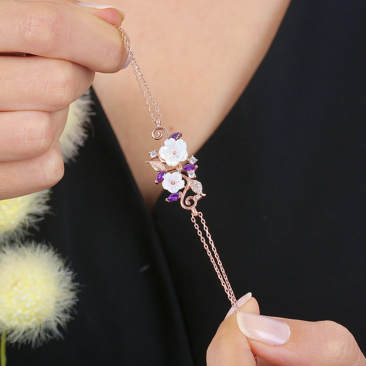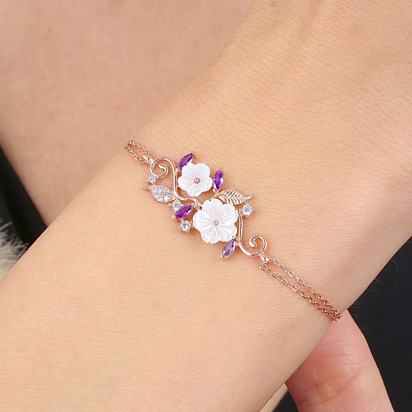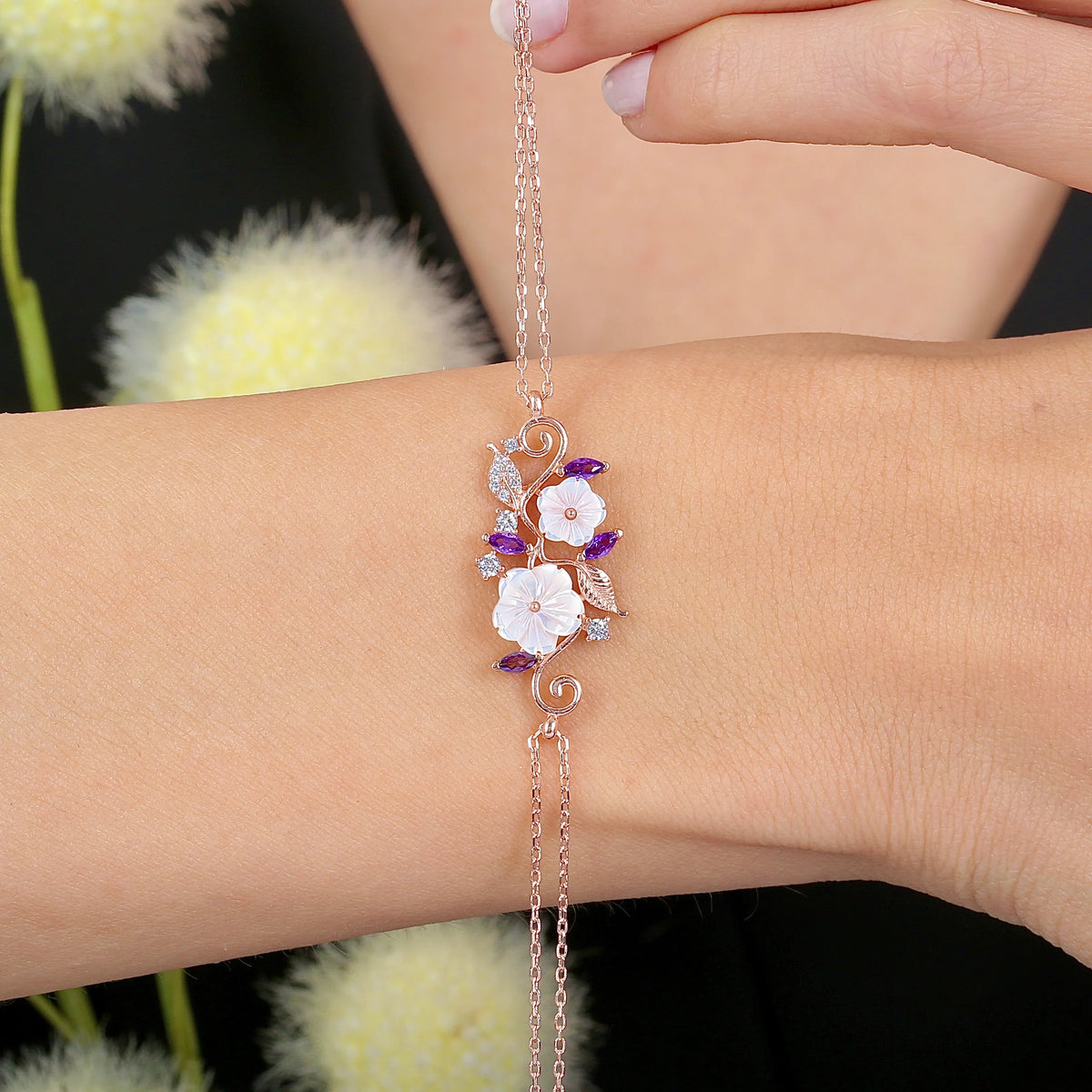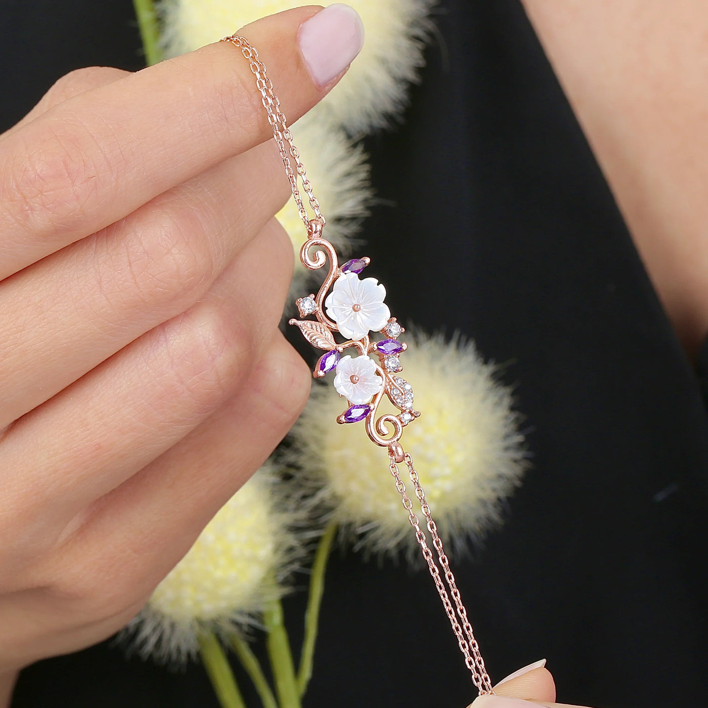 Magnolia Symphony Vine with Amethyst Gem CZ Rose Gold 925K Sterling Silver Bracelet