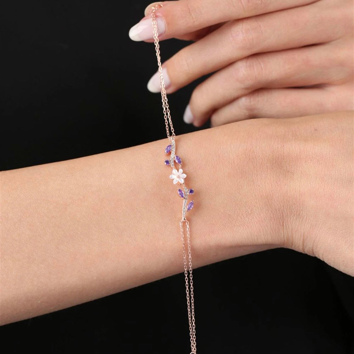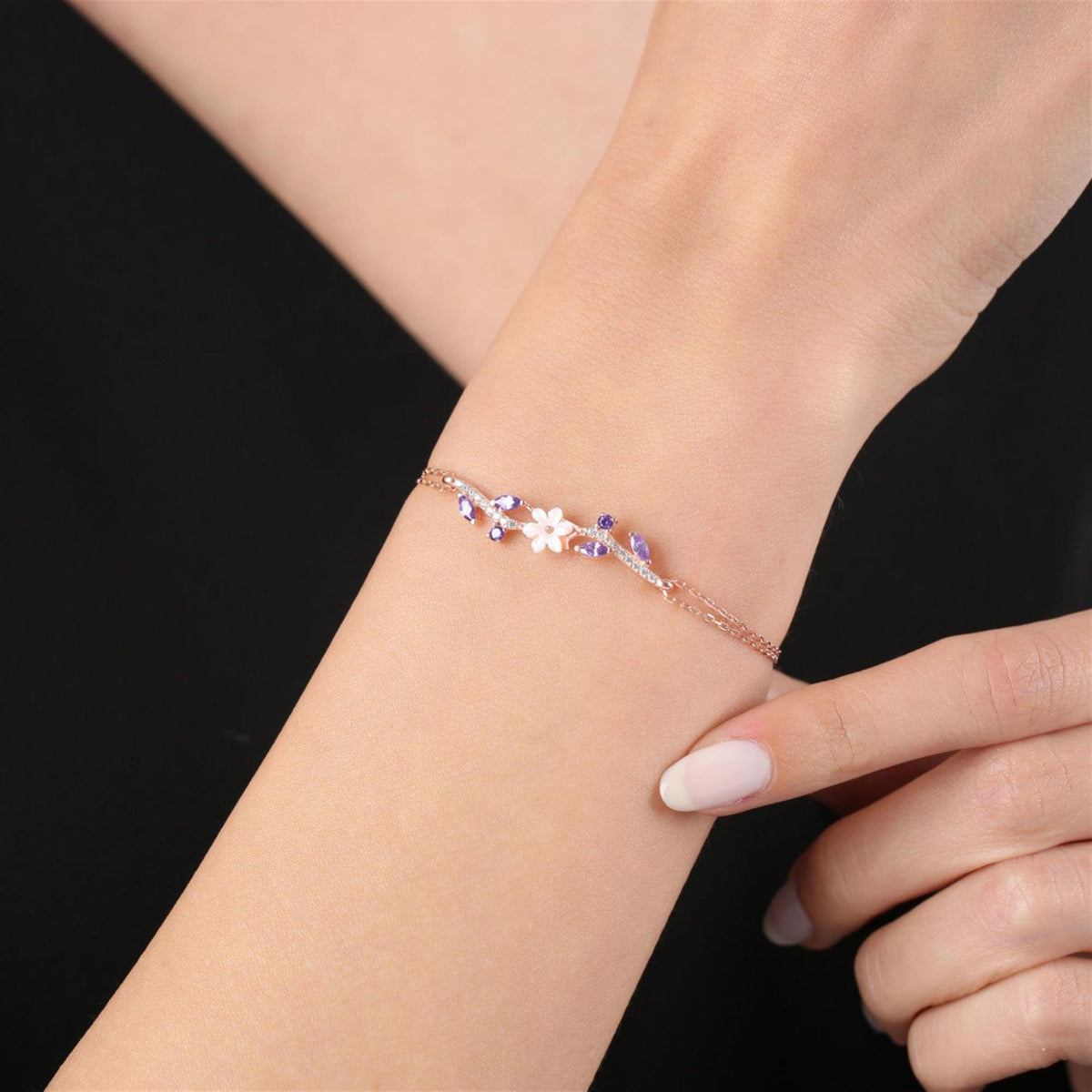 Magnolia Whisper Bloom Amethyst Color CZ Rose Gold 925K Sterling Silver Bracelet