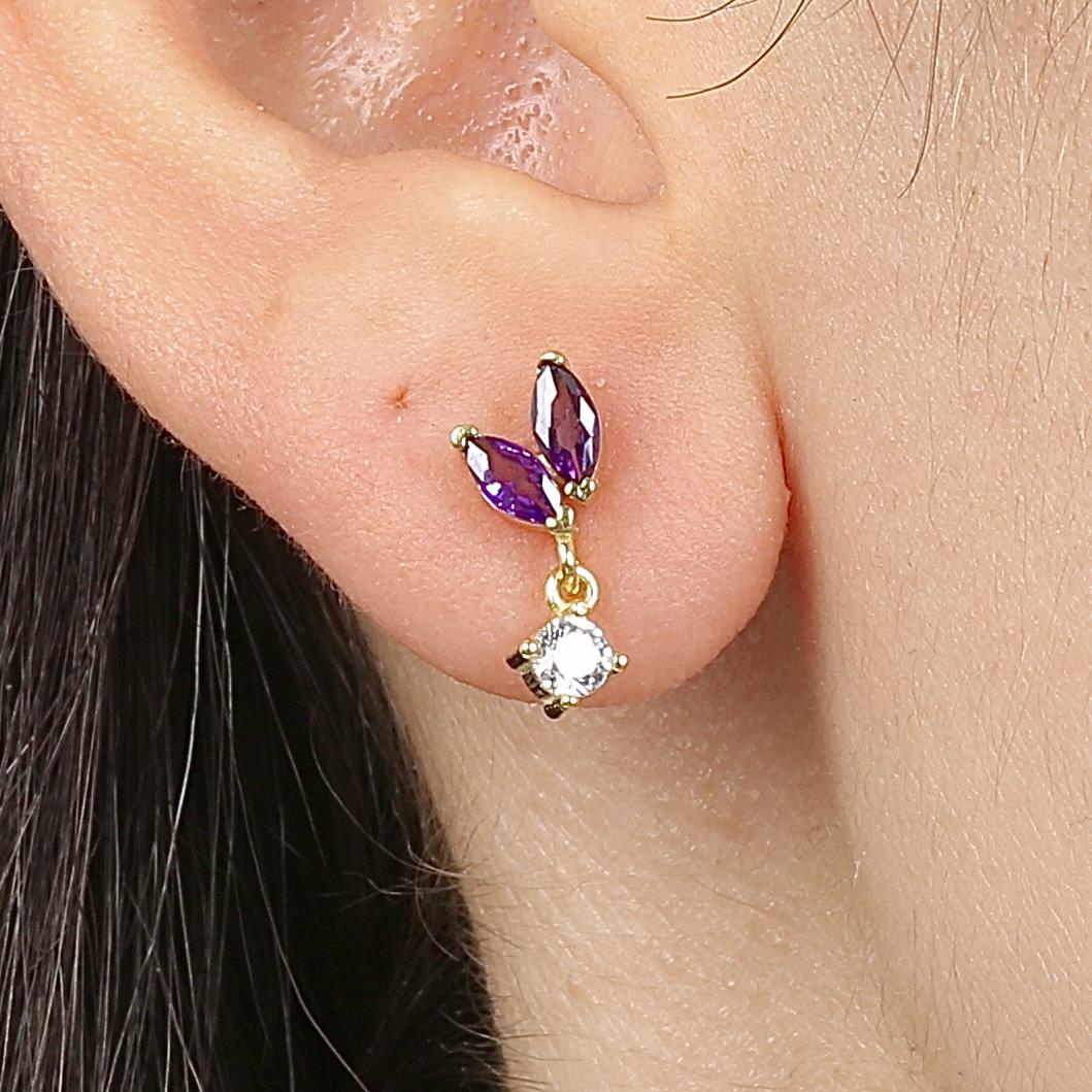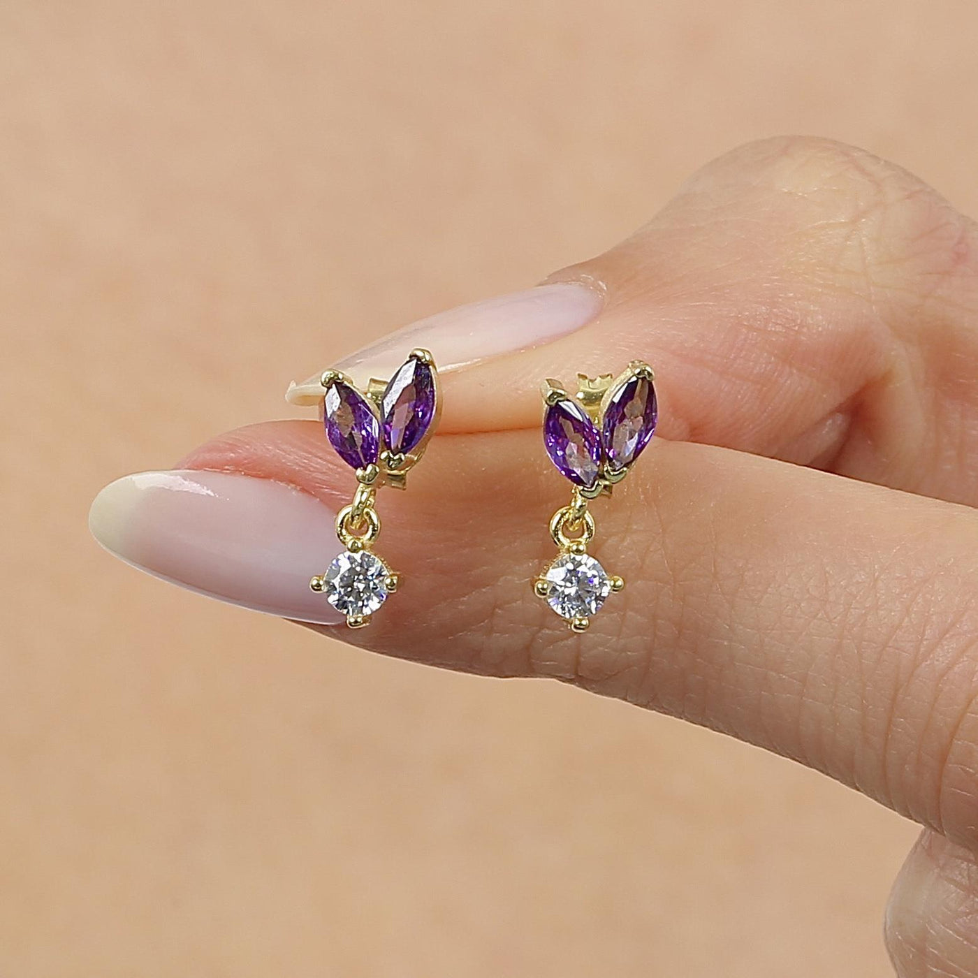Let elegance bloom with the Radiant Blossom Bud Amethyst Color CZ 14K Gold Earrings. Featuring amethyst color cubic zirconia stones in a delicate bud-inspired design, these earrings evoke a sense of calm, creativity, and timeless femininity. Their soft purple glow is enhanced by the warm radiance of 14K gold.