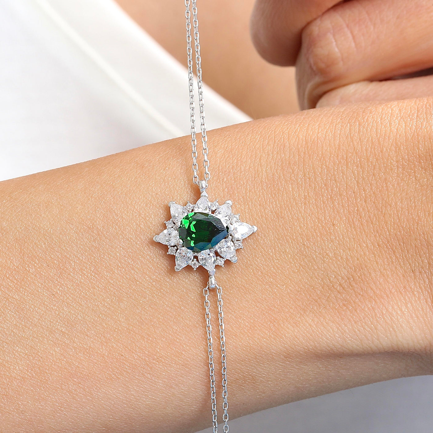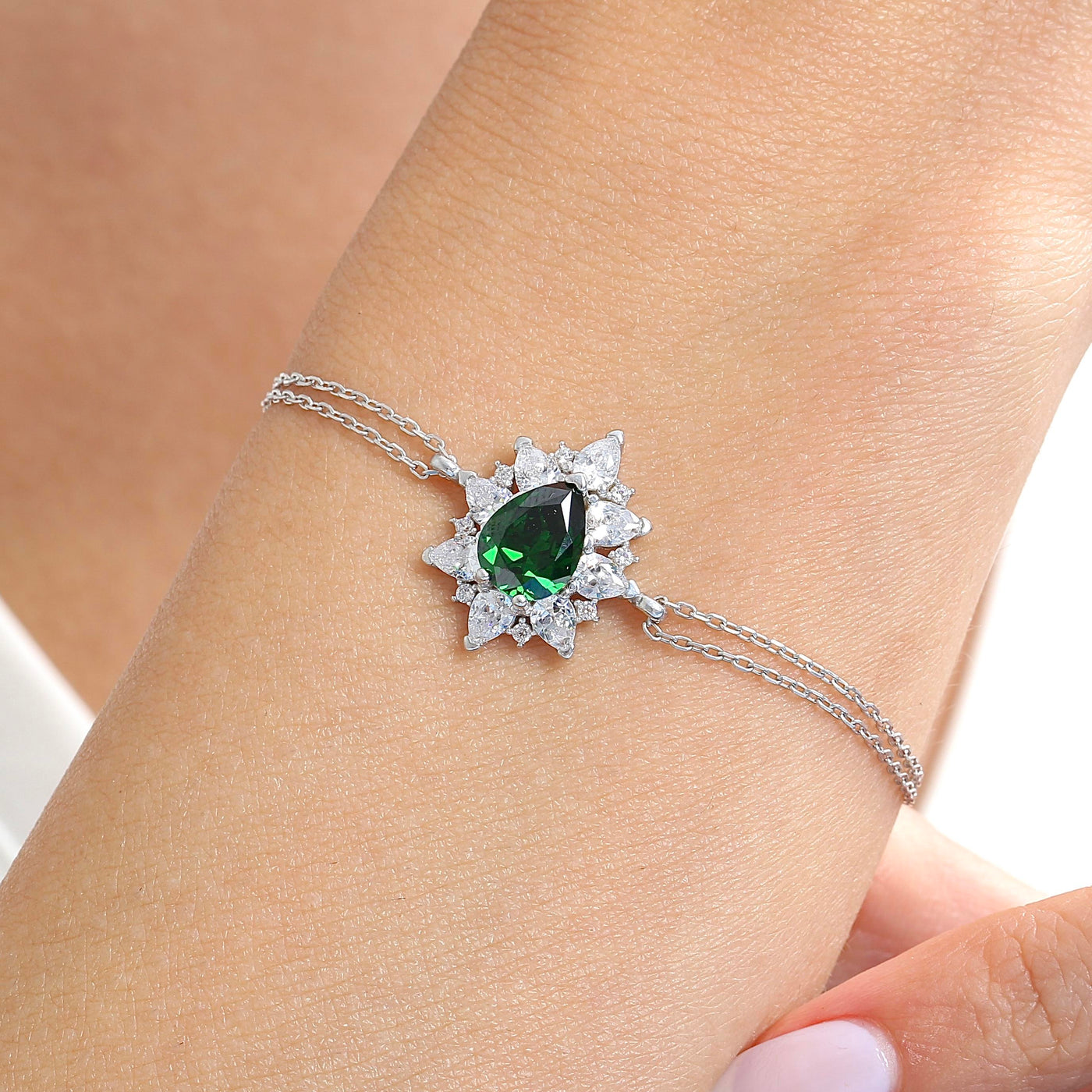 Celebrate the elegance of nature with the Radiant Emerald Color Royal Bloom CZ 925K Sterling Silver Bracelet. Showcasing vibrant emerald color cubic zirconia in delicate floral designs, this bracelet glows with a rich yeşil hue that evokes renewal, harmony, and timeless sophistication. Each sparkle brings graceful energy to your every movement.
