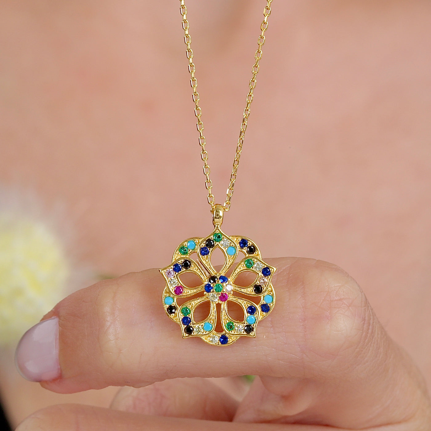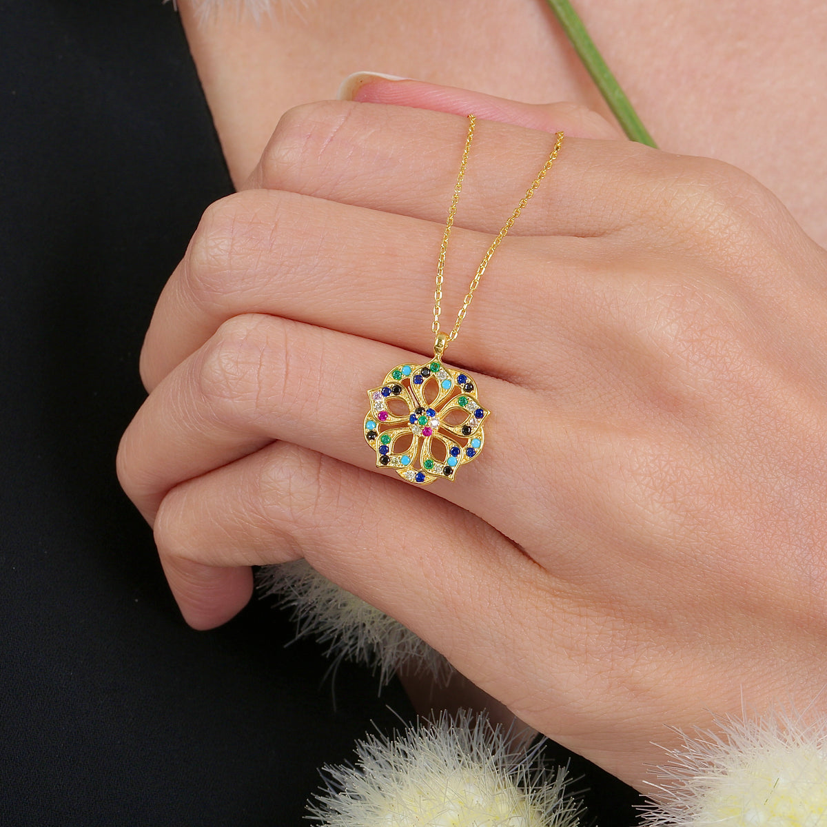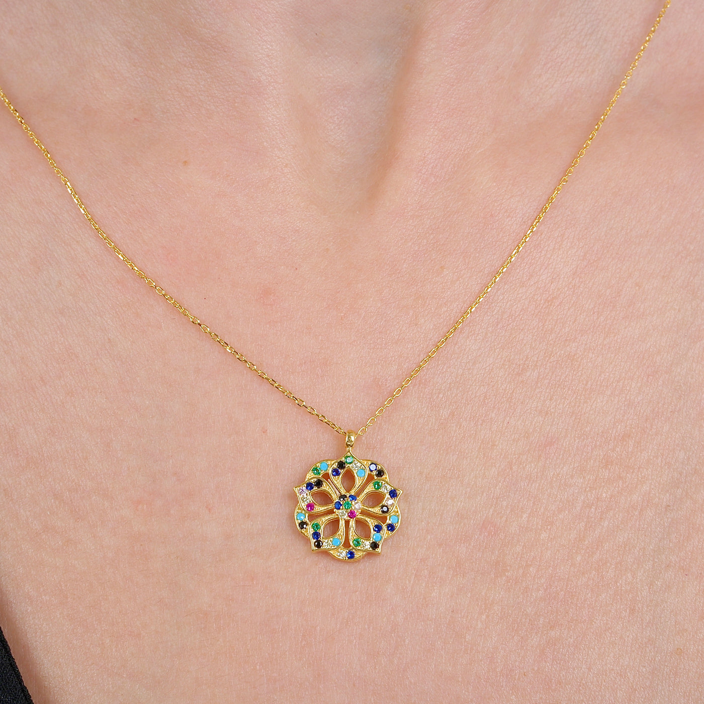 Embrace the vibrant elegance of nature with the Radiant Multicolor Bloom Filigree CZ 14K Gold Necklace, where intricate filigree design meets the dazzling beauty of multicolored cubic zirconia. Featuring a stunning blooming flower design, this necklace captures the essence of spring with its array of radiant gemstones, each reflecting a different hue, symbolizing beauty, growth, and the richness of life. The delicate filigree details surrounding the flower add an element of timeless craftsmanship, giving the piece a vintage yet contemporary charm.