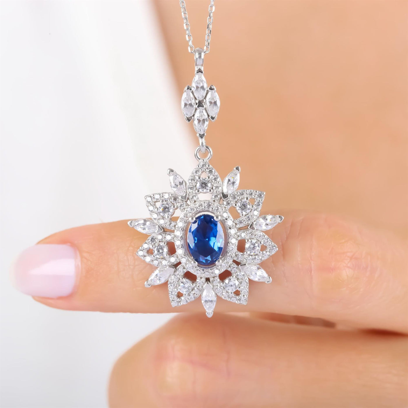 Presented in a luxurious Etossimo Jewelry gift box and bag, the Royal Bloom Sapphire Color CZ 925K Sterling Silver Necklace is a glowing addition to any jewelry lover's collection.
