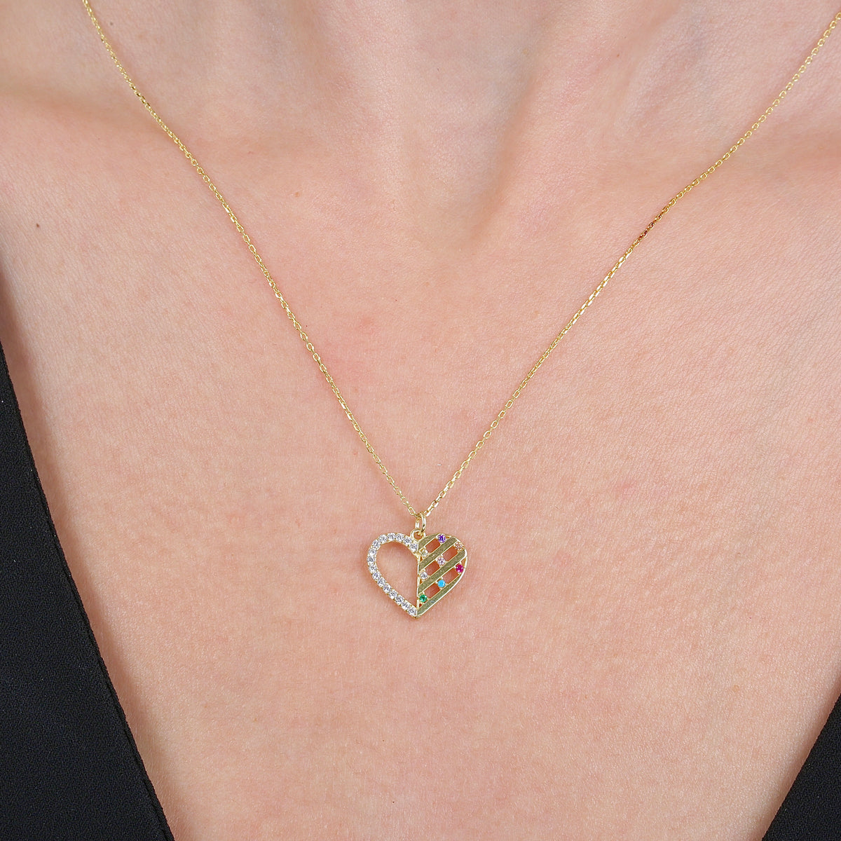 Embrace the vibrant energy of love and protection with the Shimmering Multicolor Gem Heart Talisman CZ 14K Gold Necklace. Featuring a captivating heart-shaped design, this necklace is adorned with a radiant array of multicolor cubic zirconia gemstones that shimmer with every movement. The heart symbolizes affection, while the rich spectrum of colors represents the diverse facets of life’s most cherished moments. Set in 14K gold, this necklace radiates luxury and warmth, making it a standout piece for any occasion.