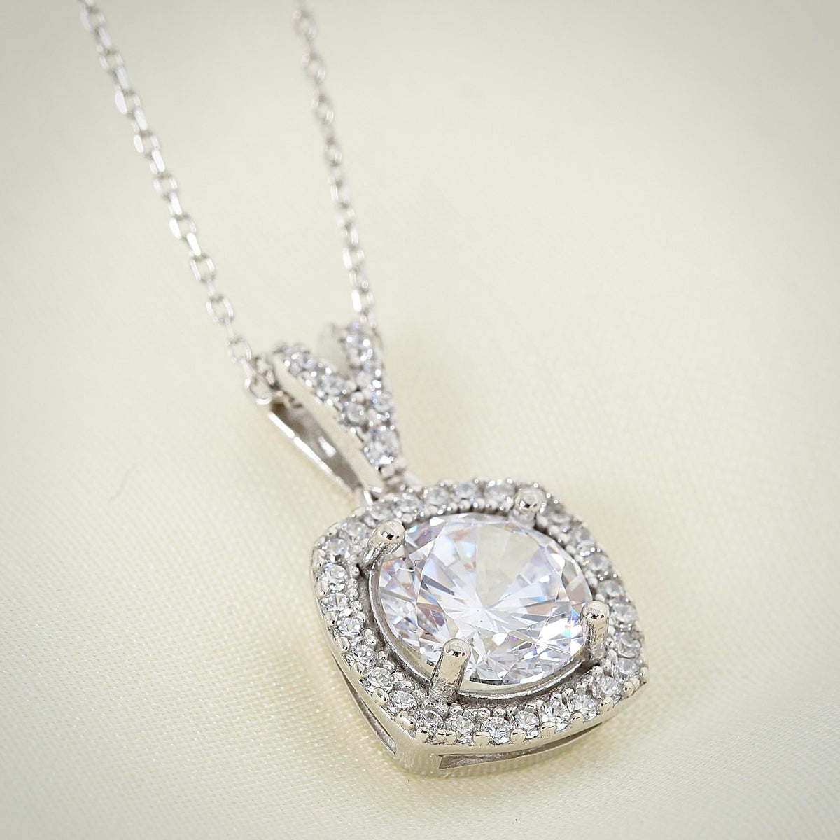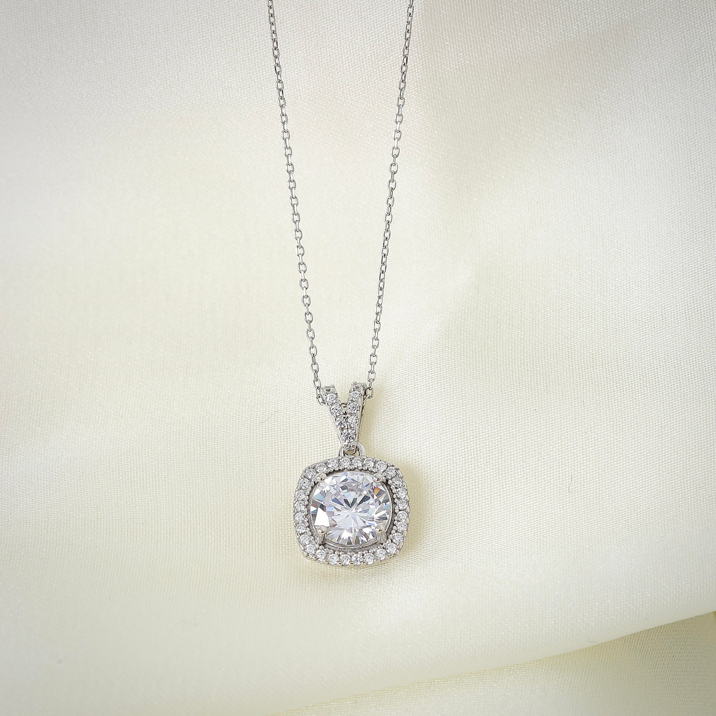 The Sparkling Grace Square Cut CZ 925K Sterling Silver Necklace combines modern sophistication with classic elegance. This striking necklace features a large square-cut cubic zirconia surrounded by a halo of smaller sparkling stones, all set in 925K sterling silver with a rhodium-plated finish for added shine. The sleek square-cut stone reflects light beautifully, creating an eye-catching sparkle from every angle.