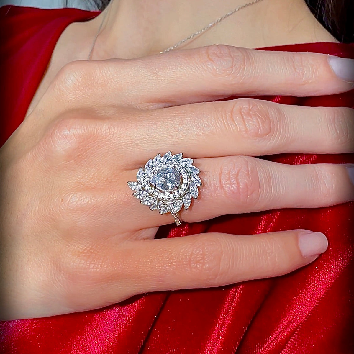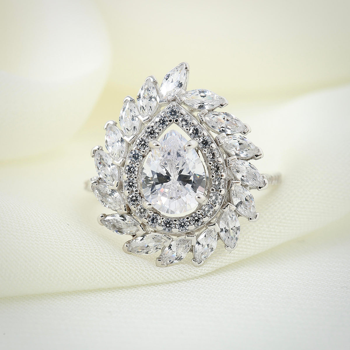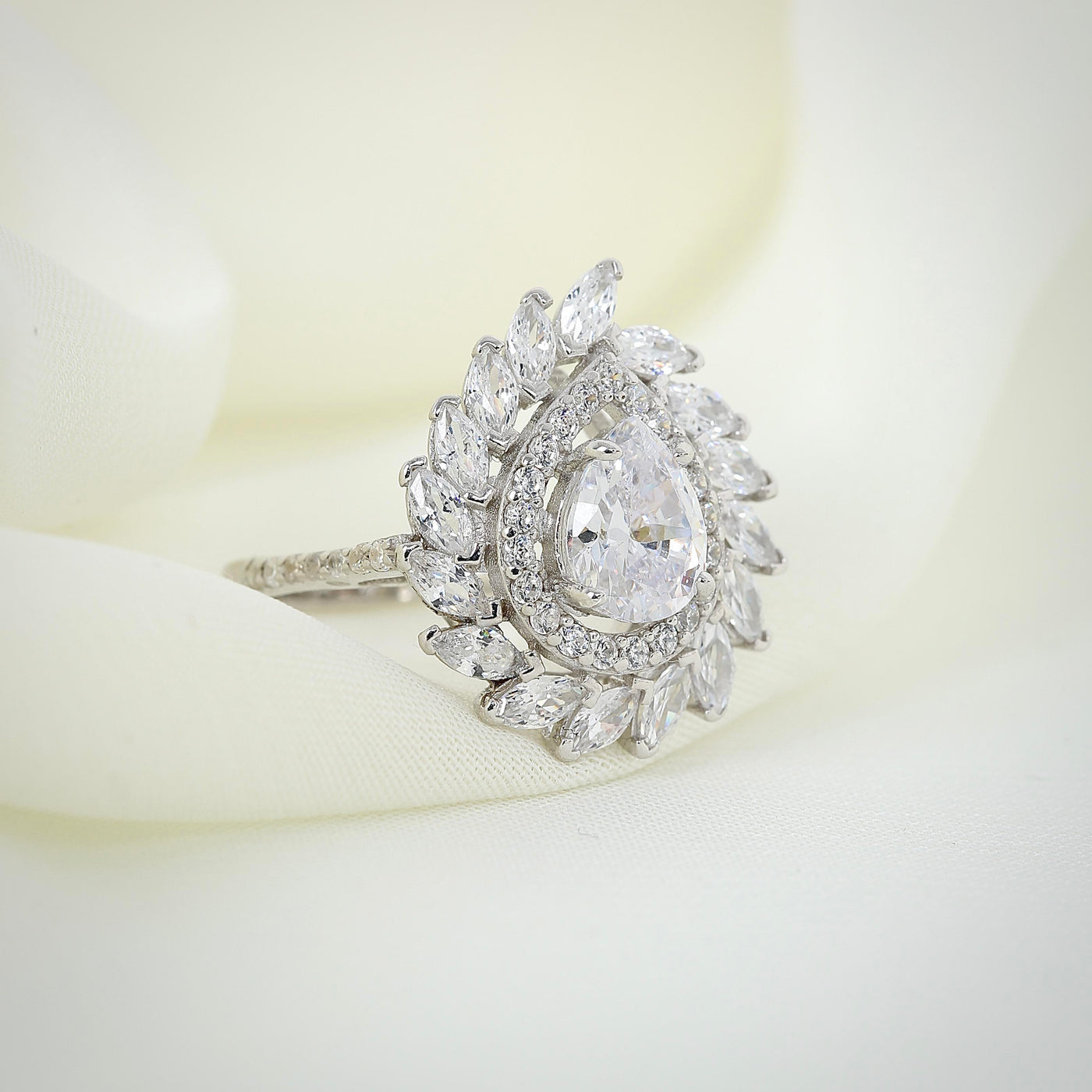 The Sparkling Marquis Serenade CZ 925K Sterling Silver Ring is a stunning display of elegance and sophistication. Crafted from high-quality 925K sterling silver, this ring features a magnificent pear-shaped cubic zirconia stone at its center, surrounded by a delicate halo of marquis-cut cubic zirconia stones that create a brilliant display of light and sparkle with every movement.