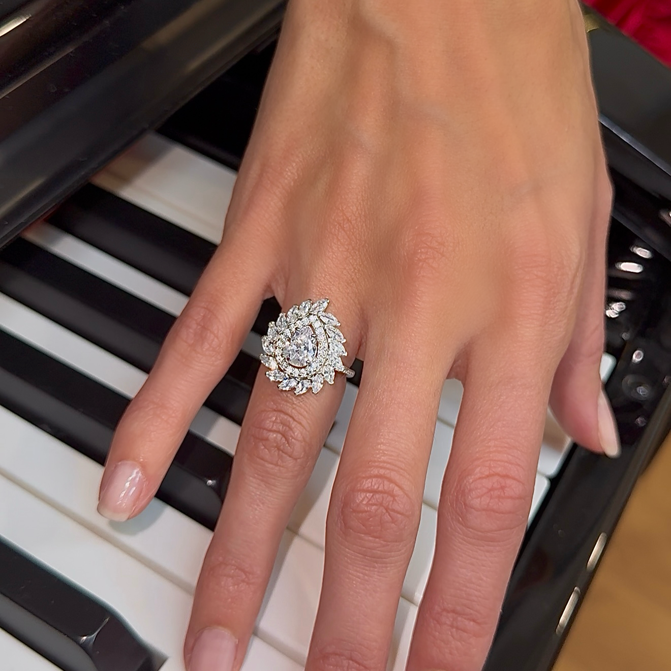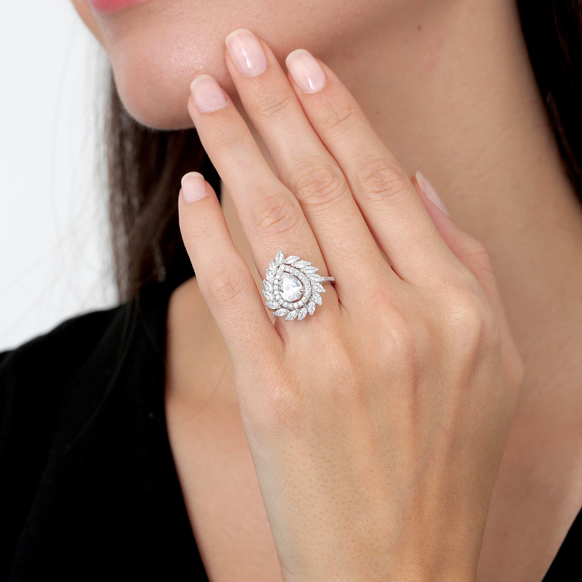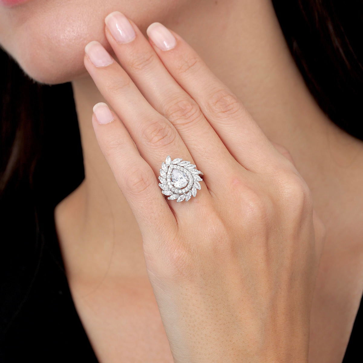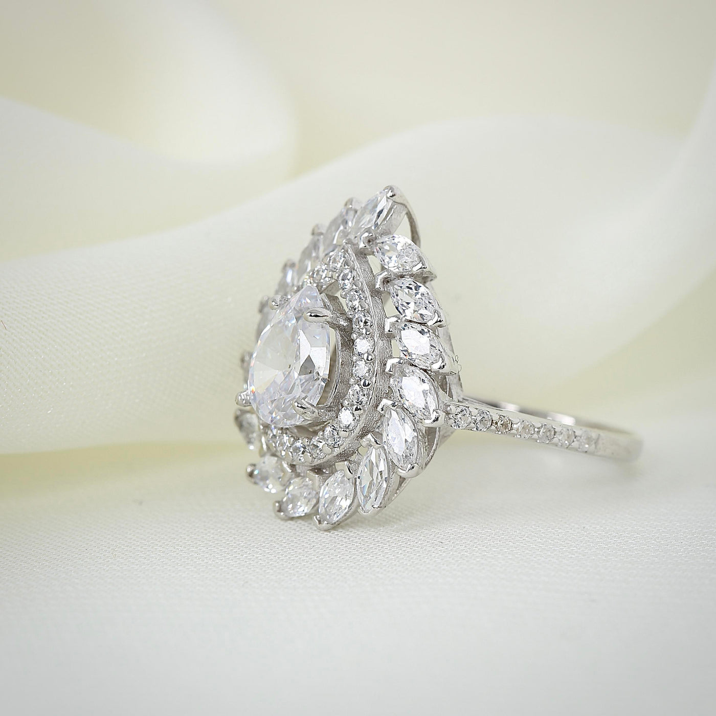 The Sparkling Marquis Serenade CZ 925K Sterling Silver Ring is a stunning display of elegance and sophistication. Crafted from high-quality 925K sterling silver, this ring features a magnificent pear-shaped cubic zirconia stone at its center, surrounded by a delicate halo of marquis-cut cubic zirconia stones that create a brilliant display of light and sparkle with every movement.