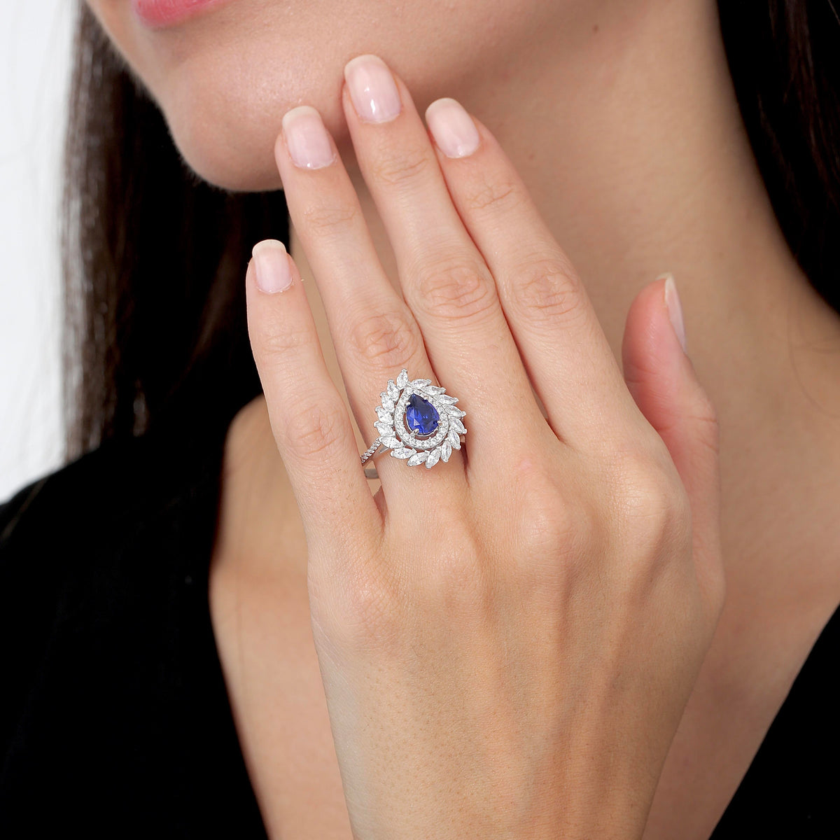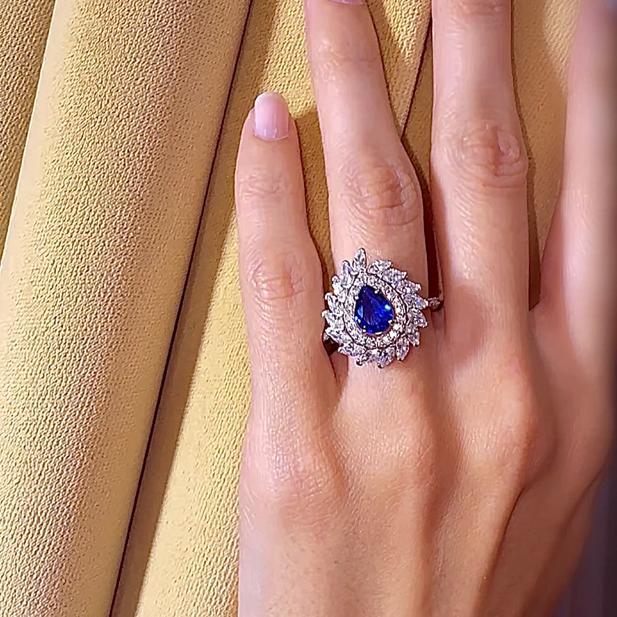 The Sparkling Marquis Serenade Sapphire Color CZ 925K Sterling Silver Ring is a breathtaking display of elegance and luxury. Crafted from high-quality 925K sterling silver, this stunning ring features a captivating synthetic sapphire center stone in a pear cut, surrounded by a radiant halo of marquis-cut cubic zirconia stones. The brilliant blue of the sapphire, paired with the sparkling zirconia accents, creates a striking contrast that captures attention with every movement.