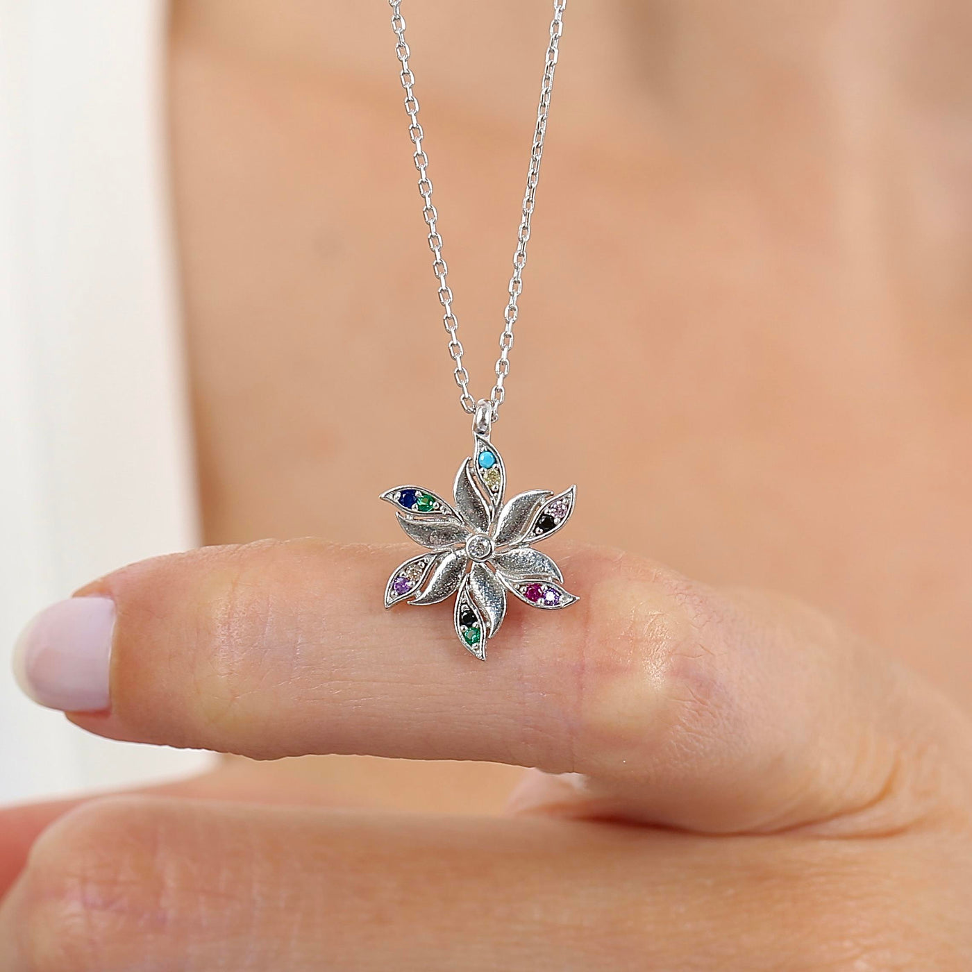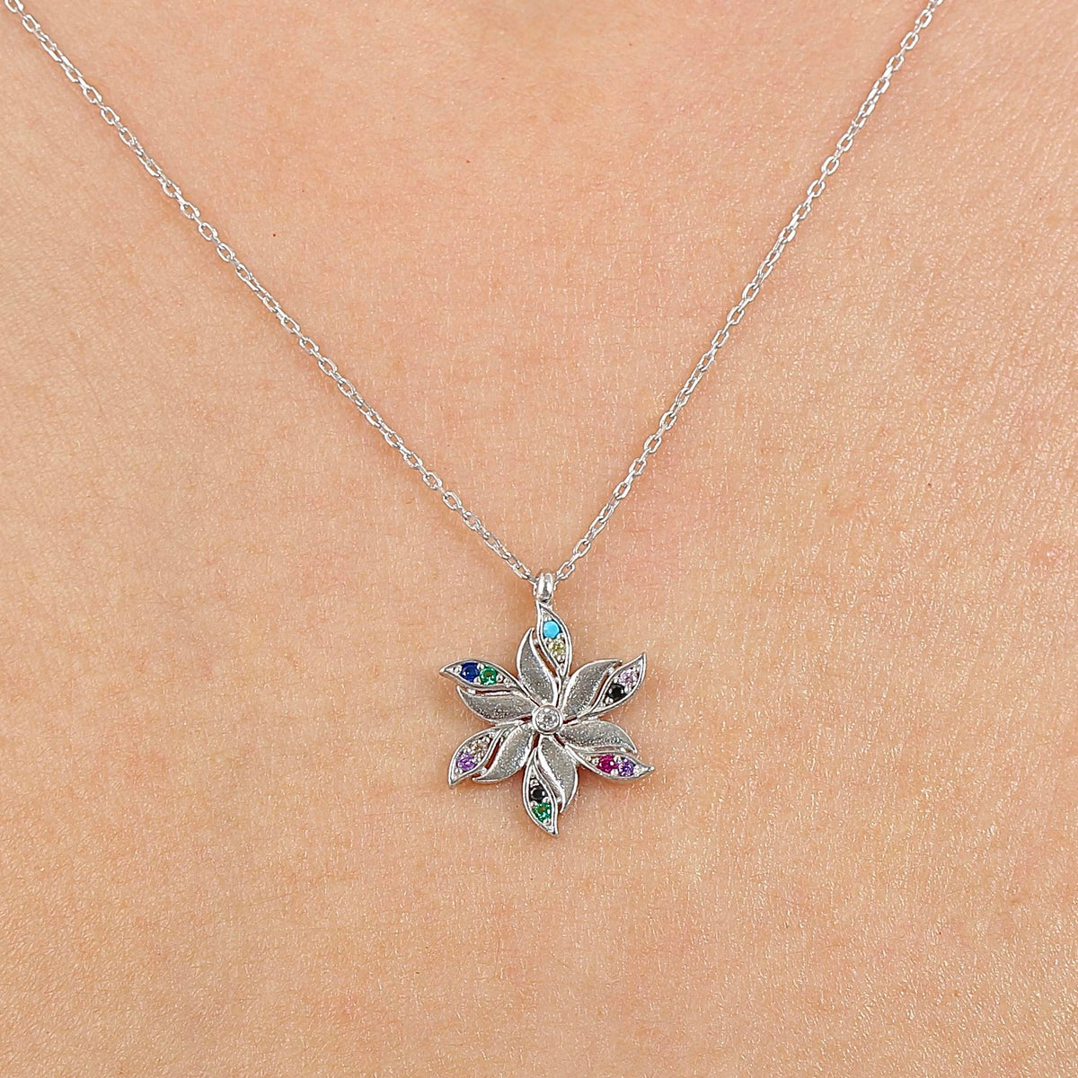 The Stellar Bloom Multicolor CZ 925K Sterling Silver Necklace is a celebration of vibrant elegance, blending celestial charm with a burst of colorful radiance. Handcrafted from premium 925K sterling silver, this necklace features a floral-inspired motif adorned with dazzling multicolor cubic zirconia stones, offering a playful yet refined sparkle with every glance.