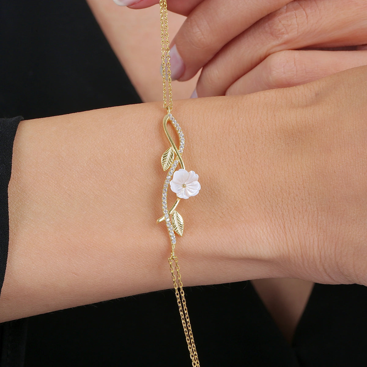 Designed to evoke a sense of serenity and timeless beauty, the bracelet’s gentle curve wraps comfortably around the wrist, offering both sophistication and everyday wearability. The CZ stones bring a touch of sparkle, reminiscent of dewdrops glistening on the delicate flowers in the early morning light.