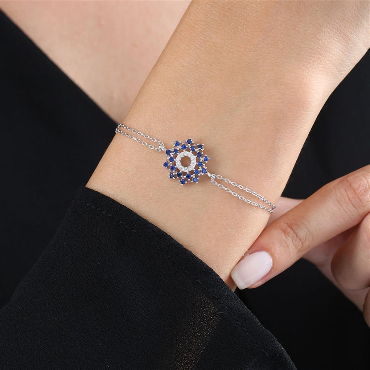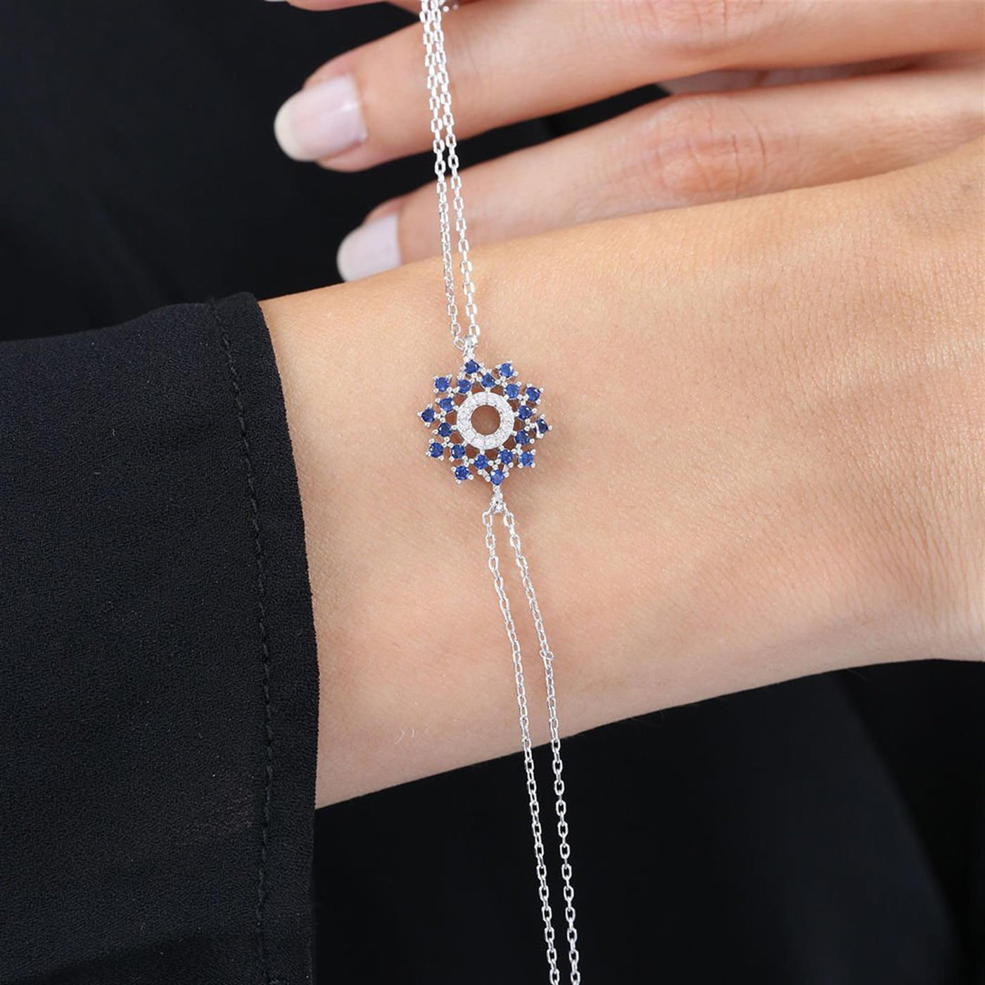 Winter Wonderland Snowflake Sapphire Color CZ 925K Sterling Silver Bracelet